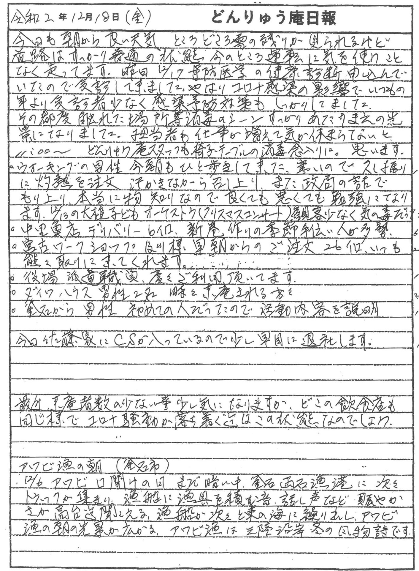 「アワビ口開けの日」の12月6日に釜石市両石(りょういし)漁港で始まった冬の風物詩 アワビ漁や、コミュニティハウス「どんりゅう庵」のお客様などについて、震災機構のお嬢こと佐藤悦子特別顧問(岩手県大槌町在住)がレポートします。
