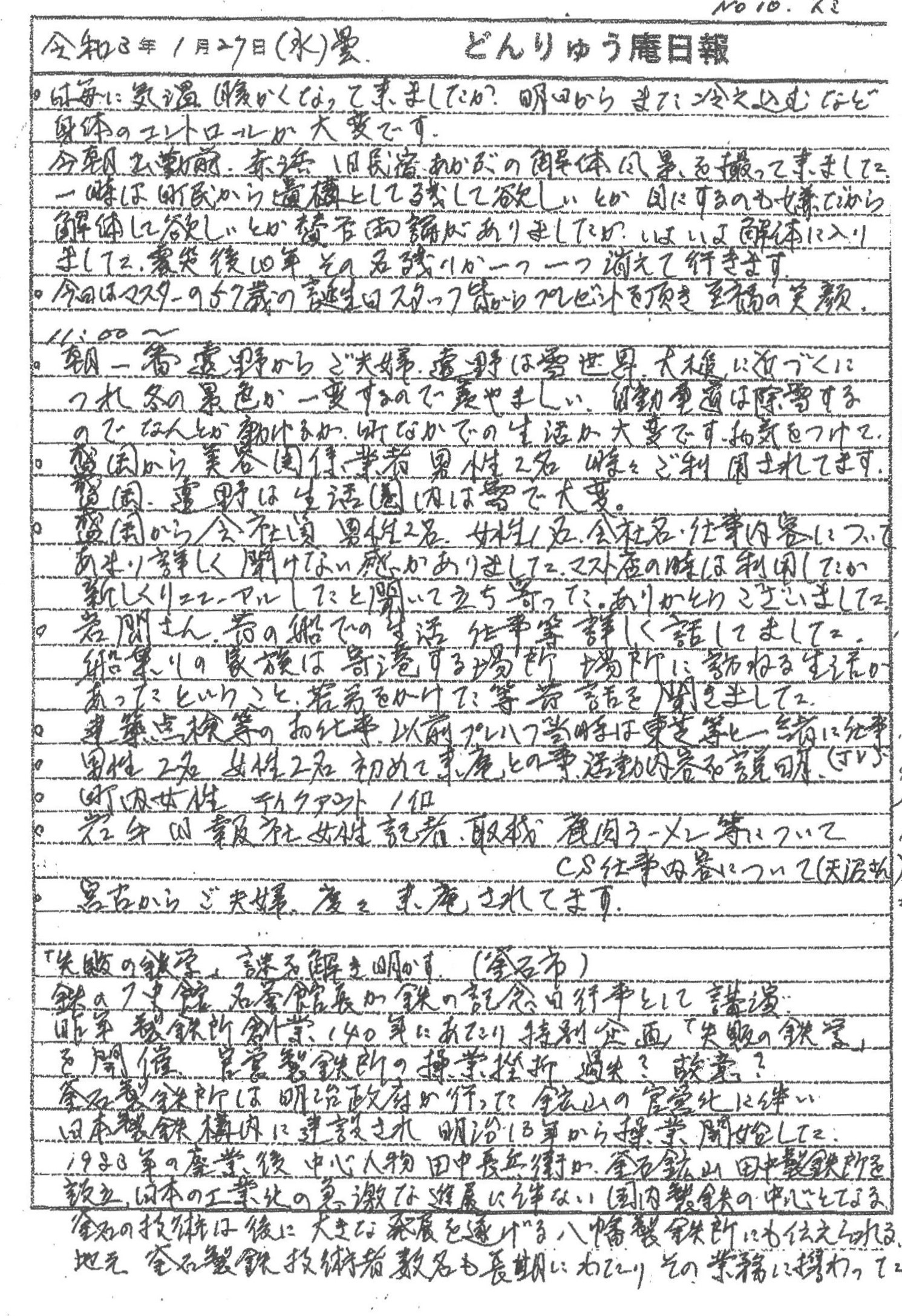 東日本大震災の津波により観光船「はまゆり」が屋根の上に乗り上げた旧「民宿あかぶ」の解体風景や、釜石市の「鉄の歴史館」での「失敗の鉄学」講義や、コミュニティハウス「どんりゅう庵」のお客様などについて、震災機構のお嬢こと佐藤悦子特別顧問(岩手県大槌町在住)がレポートします。