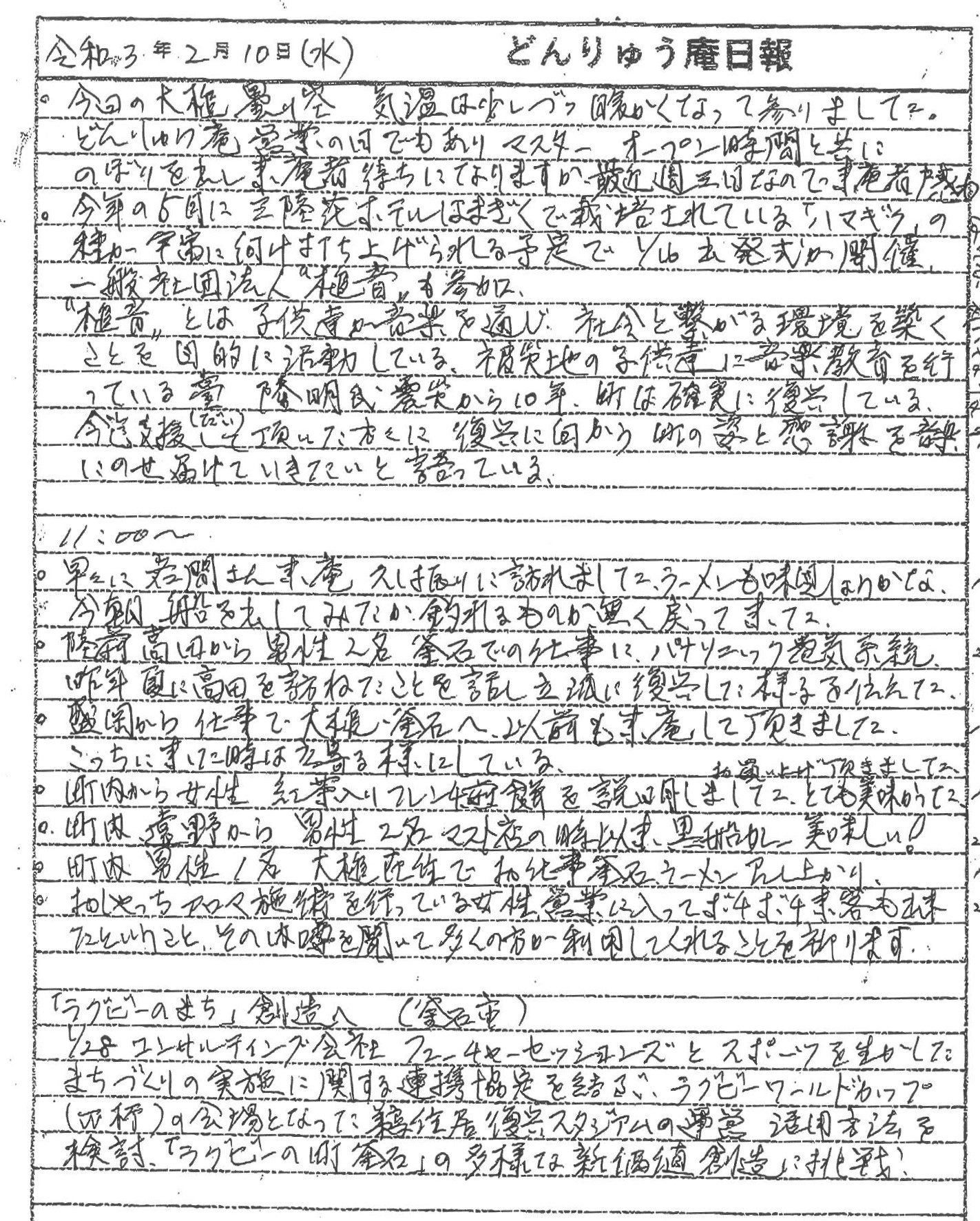 令和3年5月に宇宙から復興支援への感謝を世界に発信する「東北復興宇宙ミッション2021」の一環として宇宙船に搭載されるハマギクの種の出発式や、釜石市の「ラグビーのまち」創造へやコミュニティハウス「どんりゅう庵」のお客様などについて、震災機構のお嬢こと佐藤悦子特別顧問(岩手県大槌在住)がレポートします。
