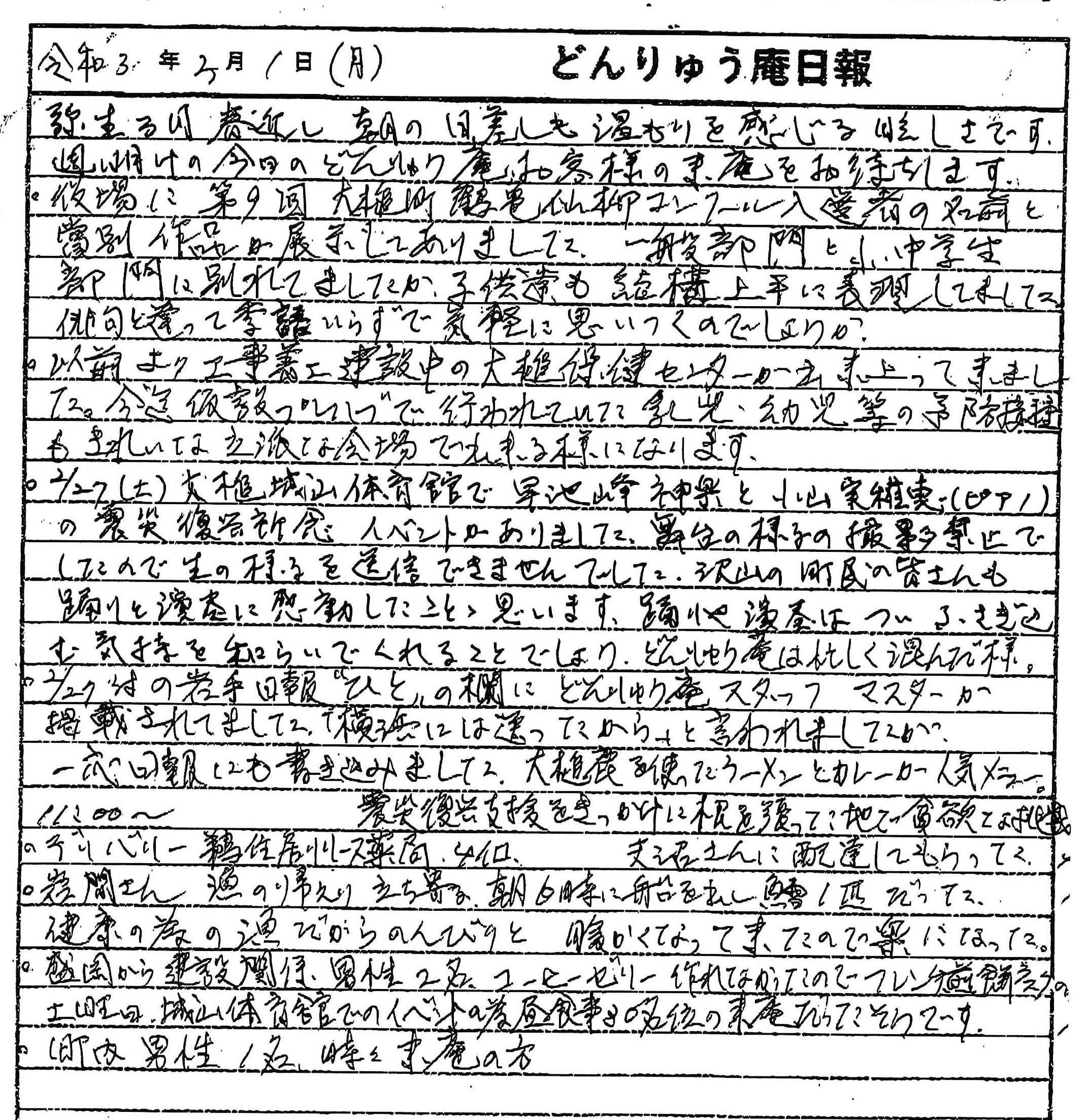 大槌町が冬場の介護予防にと取り組んでいる第9回鶴亀仙柳コンクール入選者展示や、完成近い大槌保健センターや、2月27日に行われた早池峰神楽と小山実稚恵ピアノコンサートによる震災復興祈念イベントや、コミュニティハウス「どんりゅう庵」のお客様についての震災機構のお嬢こと佐藤悦子特別顧問(岩手県大槌町在住)の現地報告です。