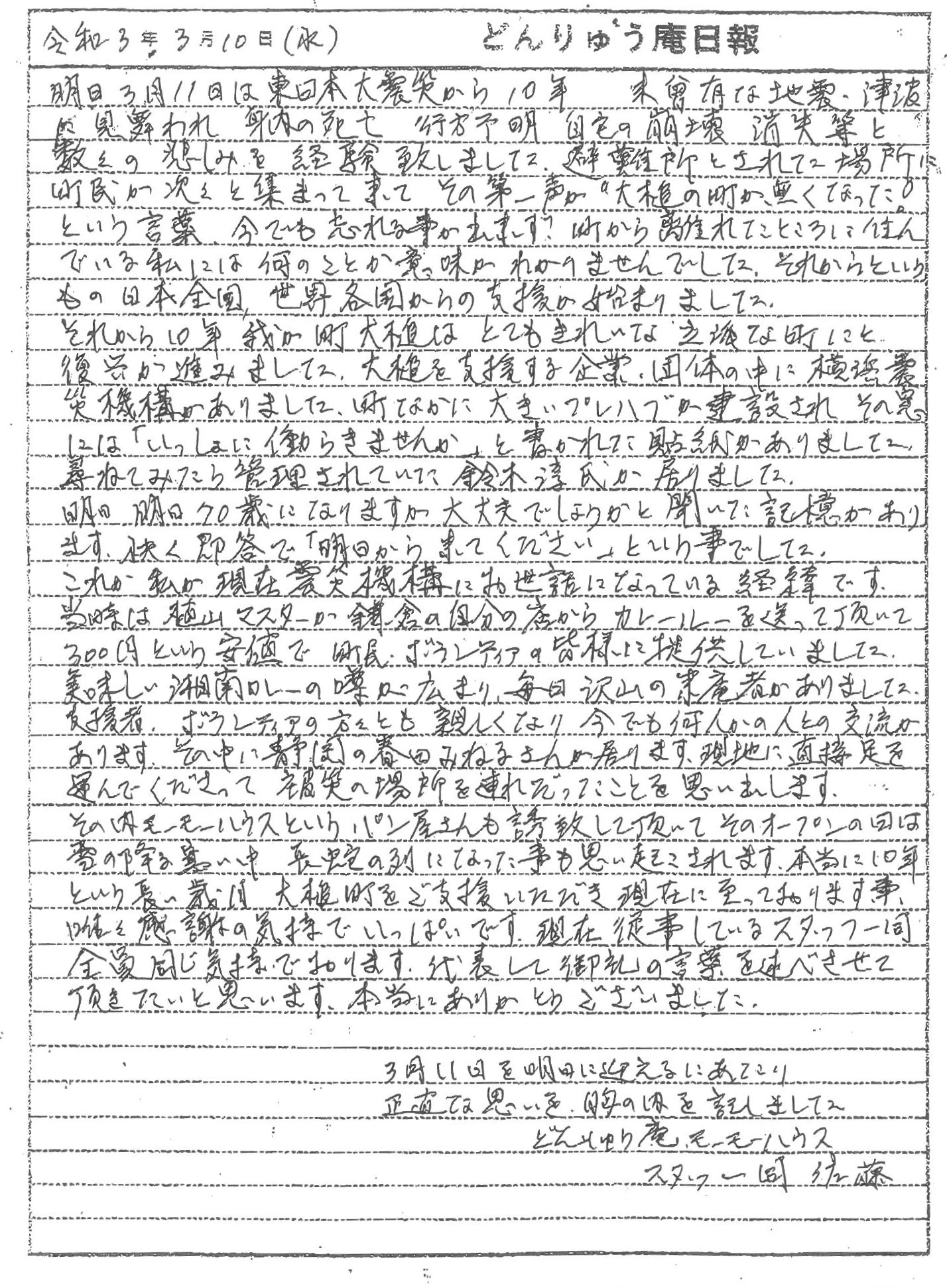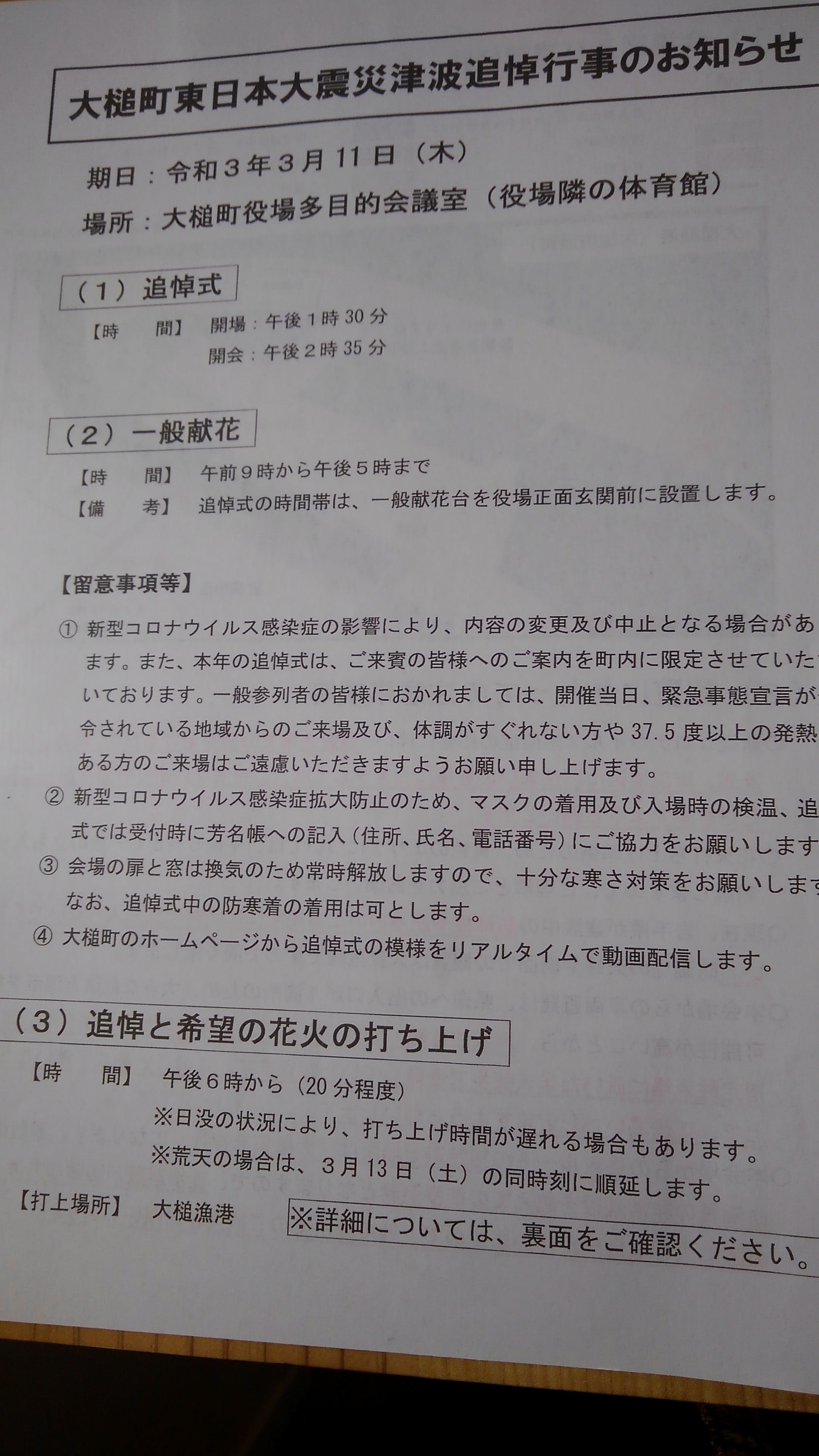 2021年3月14日 3.11を翌日に控えた大槌町の様子や、コミュニティハウス「どんりゅう庵」のお客さまや、震災機構との10年の縁について震災機構のお嬢こと佐藤悦子特別顧問(岩手県大槌町在住)による現地報告です。 3.11追悼式次第 FacebookXCopy