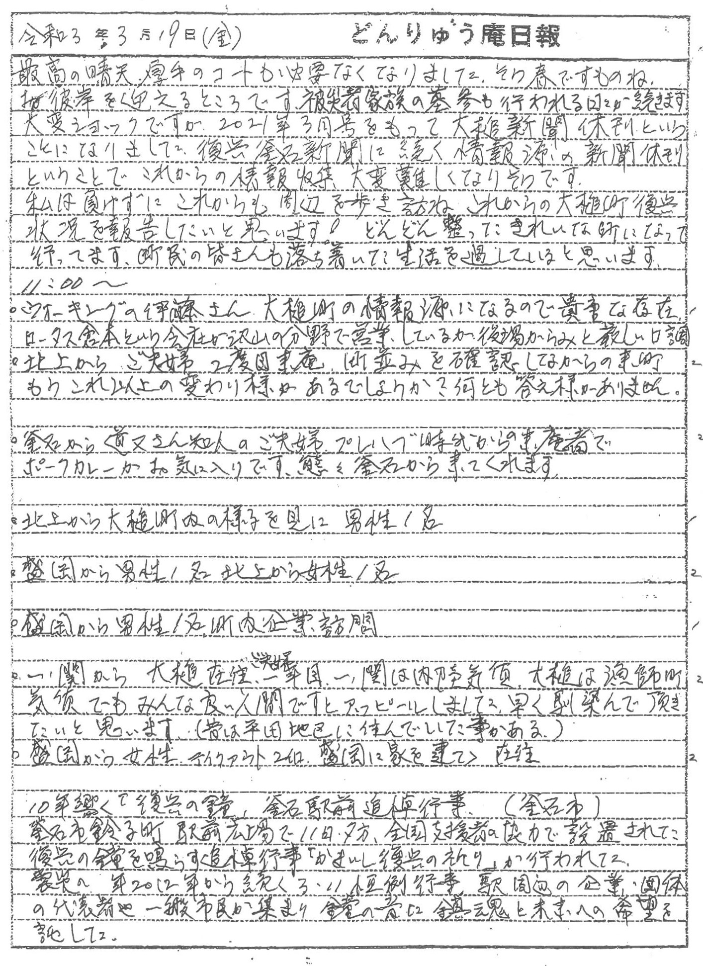 3.11に行われた2012年から毎年続く釜石市 釜石駅広場の「復興の鐘」を鳴らす追悼行事や、釜石市の復興釜石新聞の廃刊に続いて今月末で休刊される大槌新聞や、コミュニティハウス「どんりゅう庵」のお客様などについて震災機構のお嬢こと佐藤悦子特別顧問(岩手県大槌町在住)の現地報告です。
