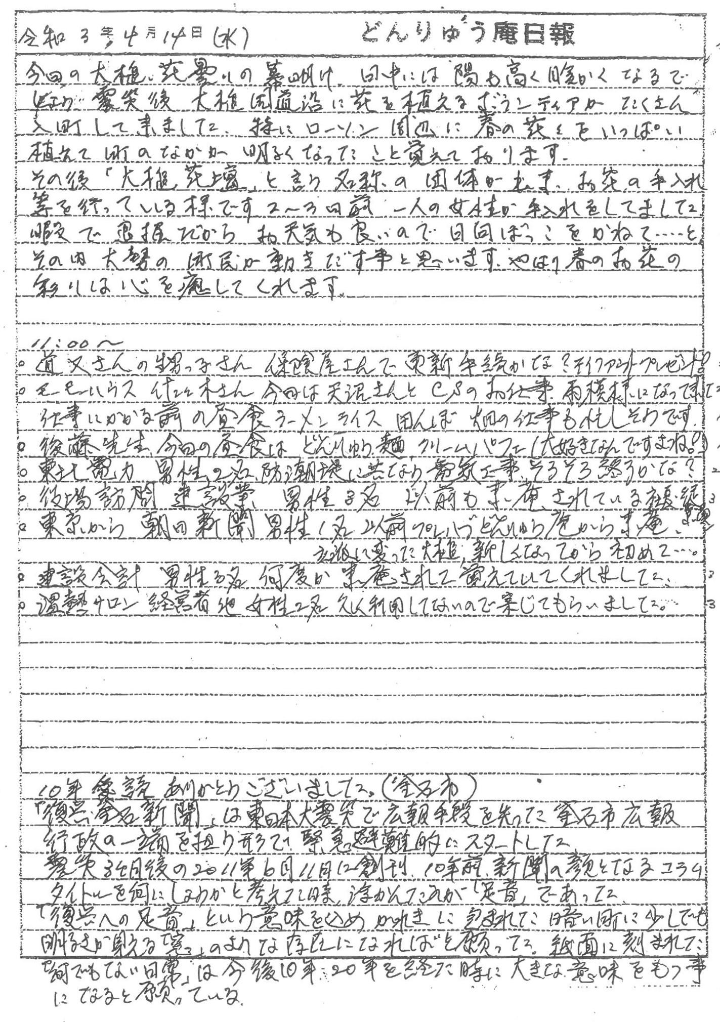 震災直後から地元釜石の被災者に暮らしの情報などを伝えてきた釜石復興新聞が10年で廃刊になったことや、復興ボランティアによる花植え活動を引き継いだ「大槌花壇」団体や、コミュニティハウス「どんりゅう庵」のお客様などについて震災機構のお嬢こと佐藤悦子特別顧問(岩手県大槌町在住)の現地報告です。
