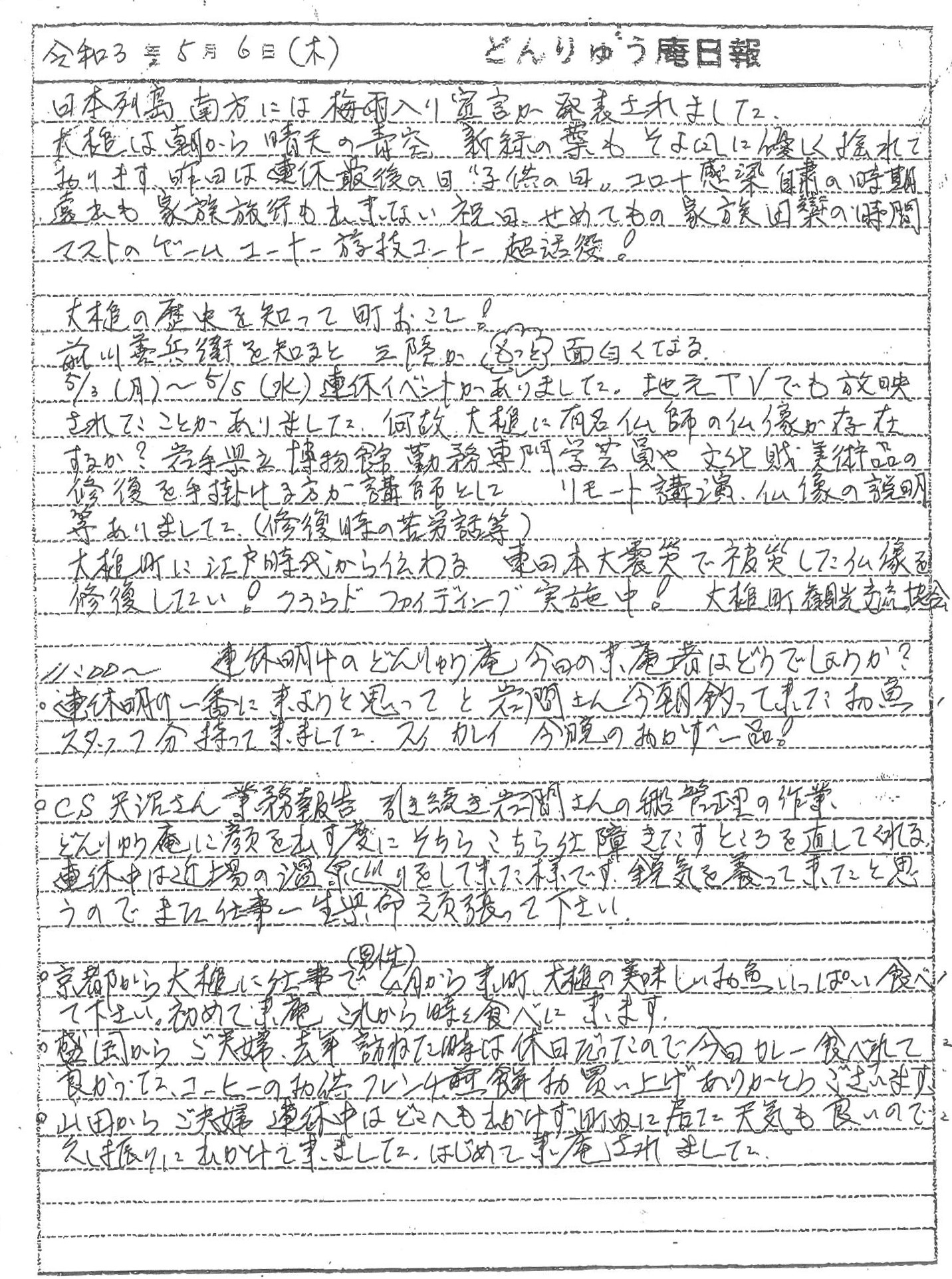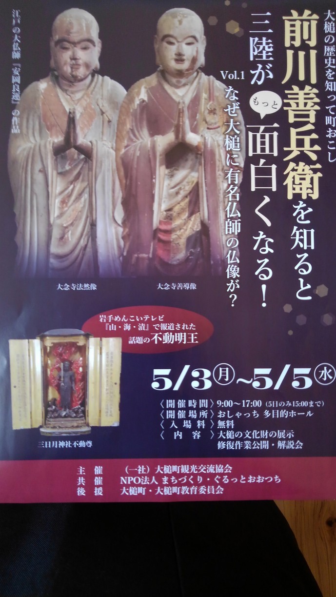 江戸時代に活躍した地元の豪商 前川善兵衛と江戸の大仏師 安岡良運が関係したといわれている大槌町の不動明王三尊像に関するイベントや、コミュニティハウス「どんりゅう庵」のお客様などについて、震災機構のお嬢こと佐藤悦子特別顧問(岩手県大槌在住)の現地報告です。