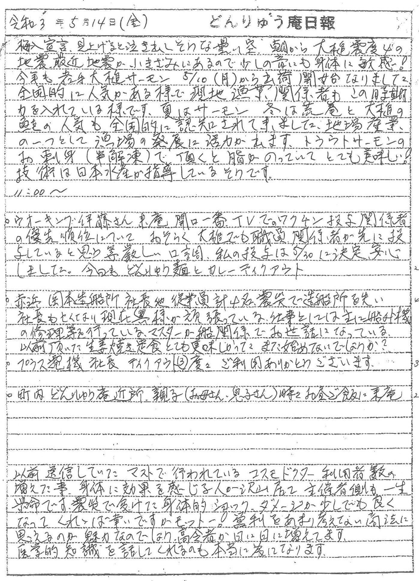 秋サケ漁の記録的な不漁が続く三陸各地でサケやマスの海面養殖が進められており、大槌ではトラウトサーモン(ニジマス)と銀鮭(ギンザケ)を「大槌サーモン」と名付け、特産品として普及を目指し、試験養殖2年目の出荷が開始されたことや、ショッピングセンターマストのコスモドクターや、コミュニティハウス「どんりゅう庵」のお客様などについて震災機構のお嬢こと佐藤悦子特別顧問(岩手県大槌在住)の現地報告です。