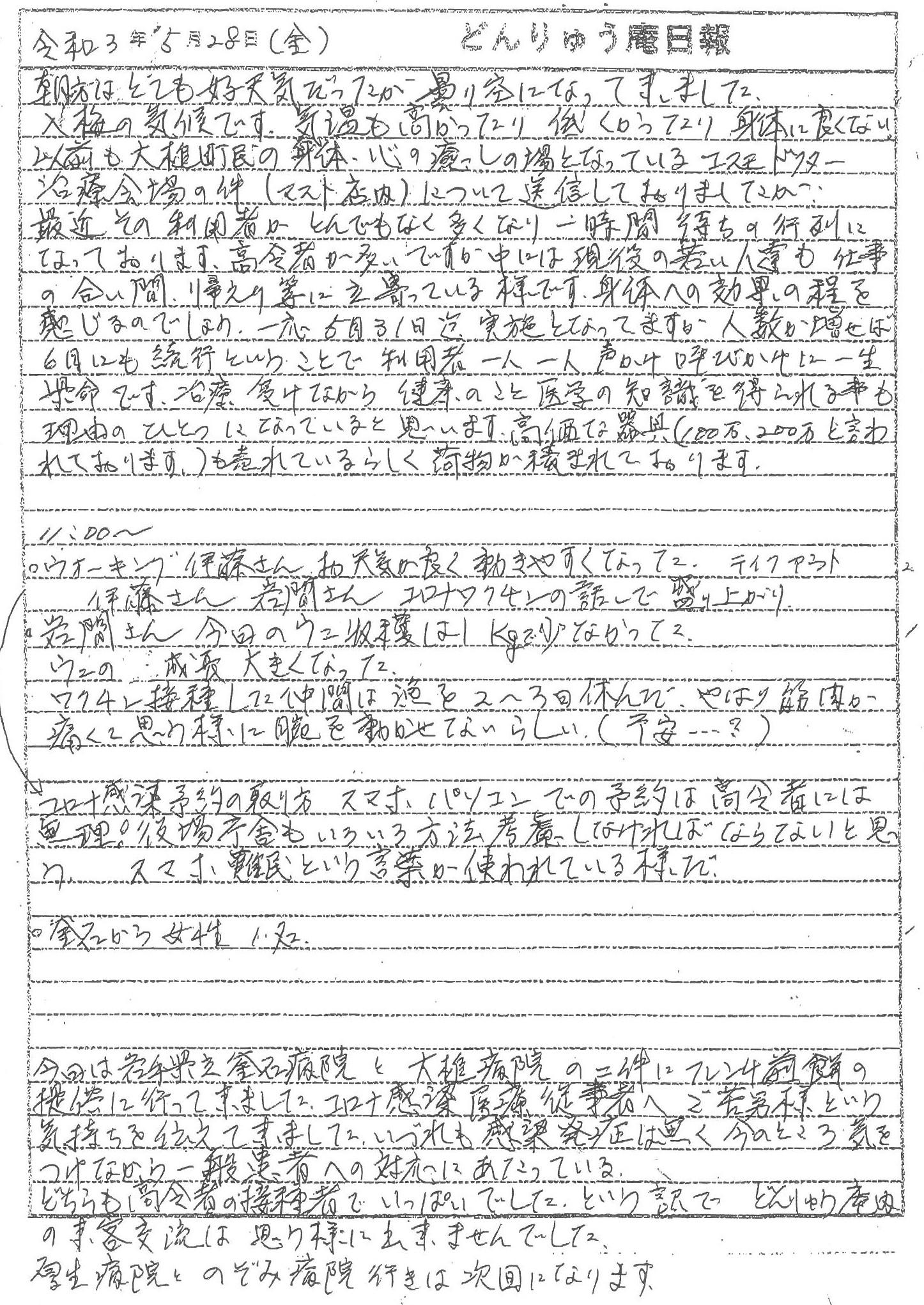 新型コロナ感染症との闘いの最前線で奮闘されている岩手県立釜石病院と大槌病院に対し、昨年に引き続きモーモーハウスの菓子の寄附助成を行ったことや、ショッピングセンター マスト内で人気を集めているコスモドクター(電位治療器)体験会場の話や、コミュニティハウス「どんりゅう庵」のお客様などについて、震災機構のお嬢こと佐藤悦子特別顧問(岩手県大槌町在住)の現地報告です。