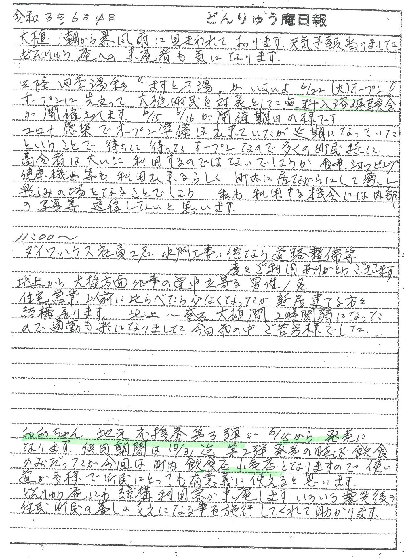6月22日のオープン前に予定された三陸四季湯彩「ますと乃湯」入浴体験会や、大槌町経済活性化支援企画「おおちゃん地元応援券」の第3弾発売開始や、コミュニティハウス「どんりゅう庵」のお客様などについて、震災機構のお嬢こと佐藤悦子特別顧問(岩手県大槌町在住)の現地報告です。