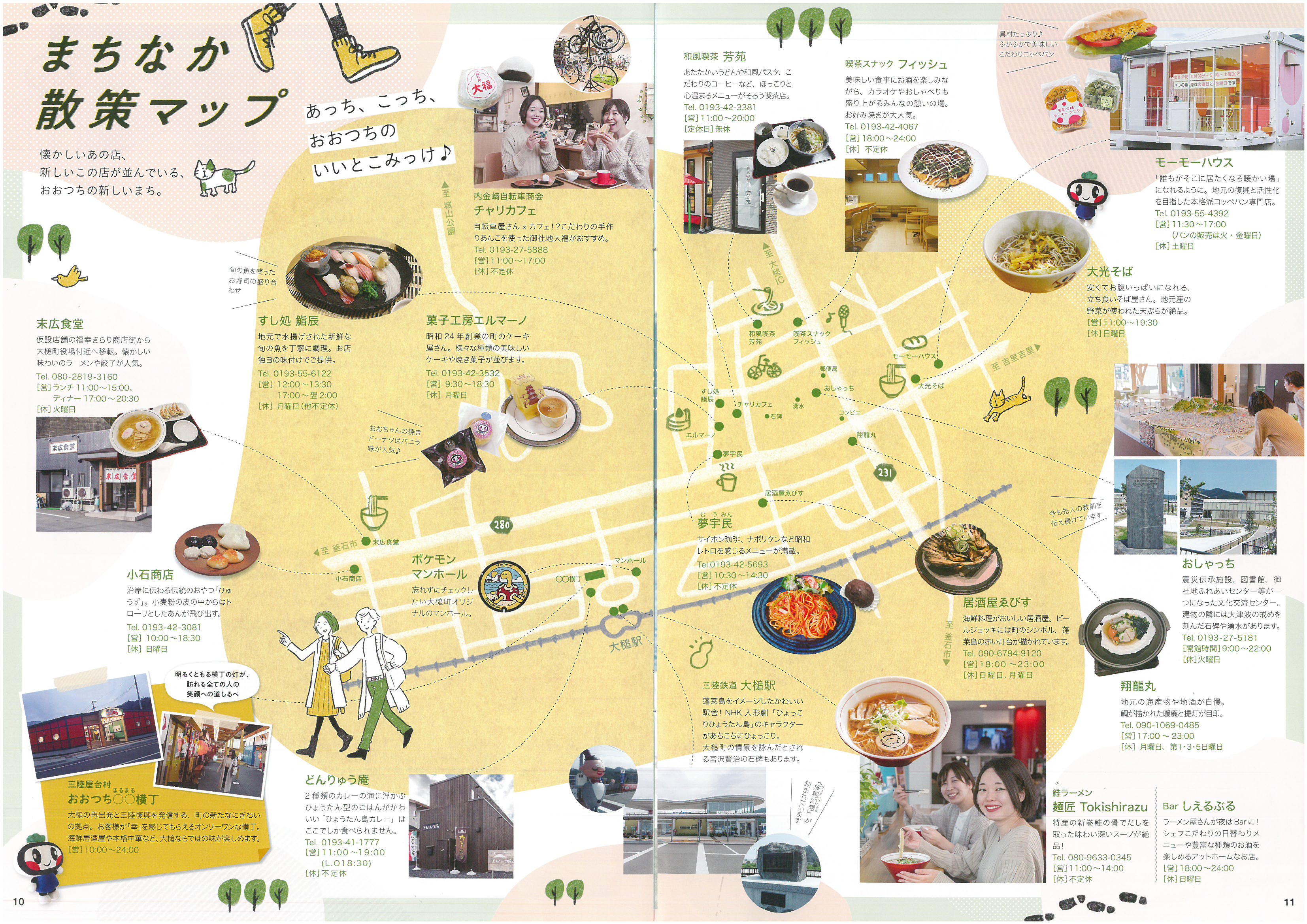 <まちなか散策マップ> 左頁下にどんりゅう庵、右頁の上隅にモ-モ-ハウス大槌が紹介されています。(なお、モーモーハウスの電話番号は変更されました。