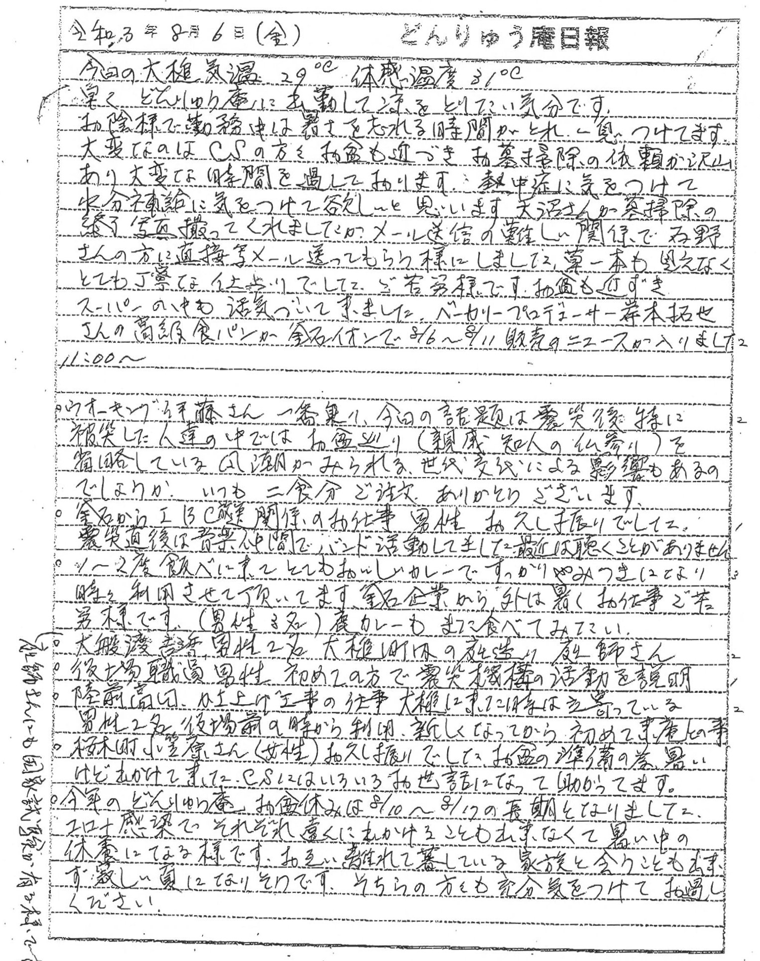 コミュニケーション ステーション(CS:生活支援事業)は、令和2年9月にコミュニティハウス「どんりゅう庵」店内に設立された庭木剪定やエアコン掃除はじめ大槌町民の幅広く身近な生活支援事業です。お盆が近づき、お墓掃除が増え猛暑の中CSスタッフが奮闘している話や、2013年モーモ-ハウスを立ち上げた際にプロデュースして下さった岸本拓也氏(現ジャパンベーカリーマーケティング社長)が、釜石イオンで高級食パンを8/6-8/11に販売することや、どんりゅう庵のお客様などについて、震災機構のお嬢こと佐藤悦子特別顧問(岩手県大槌町在住)の現地報告です。
