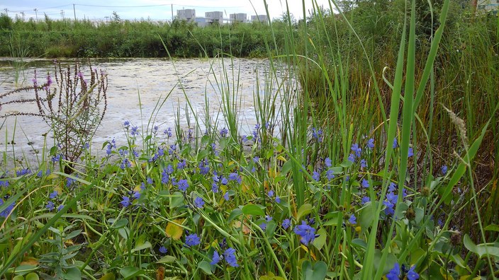 「鎮魂の森」予定地に群生するミズアオイ(水葵)