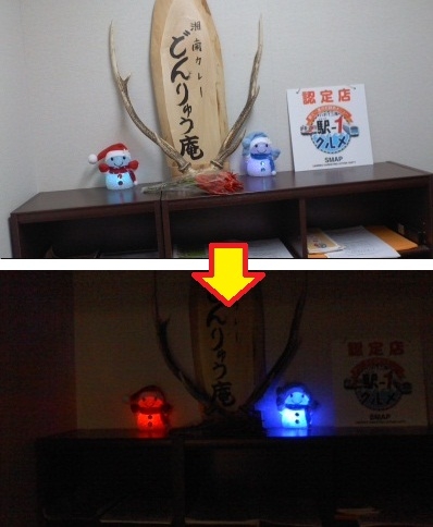2012年12月13日 どんりゅう庵もクリスマス仕様に衣替えしました。 来庵される皆様が癒されますように・・ 写真上:クリスマスツリー 写真下:常連のいろは宿の道又様からいただきました雪だるまの置物。 夜になると光ります。 FacebookXCopy