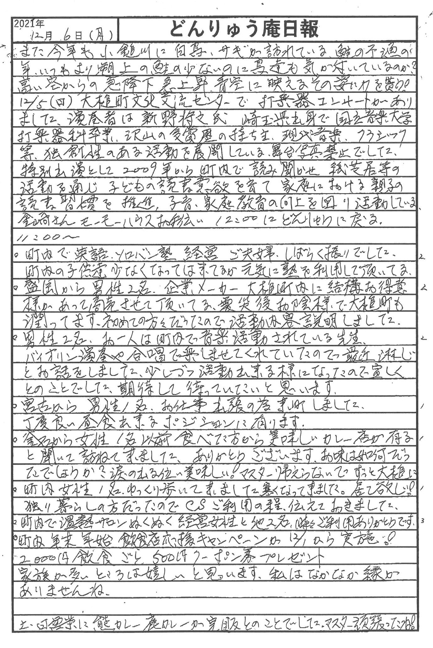 今年も小鎚川に白鳥やサギが飛来しました。おしゃっち(大槌町文化交流センター)での打楽器コンサートや、コミュニティハウス「どんりゅう庵」のお客様などについて、震災機構のお嬢こと佐藤悦子特別顧問(現地報告)です。