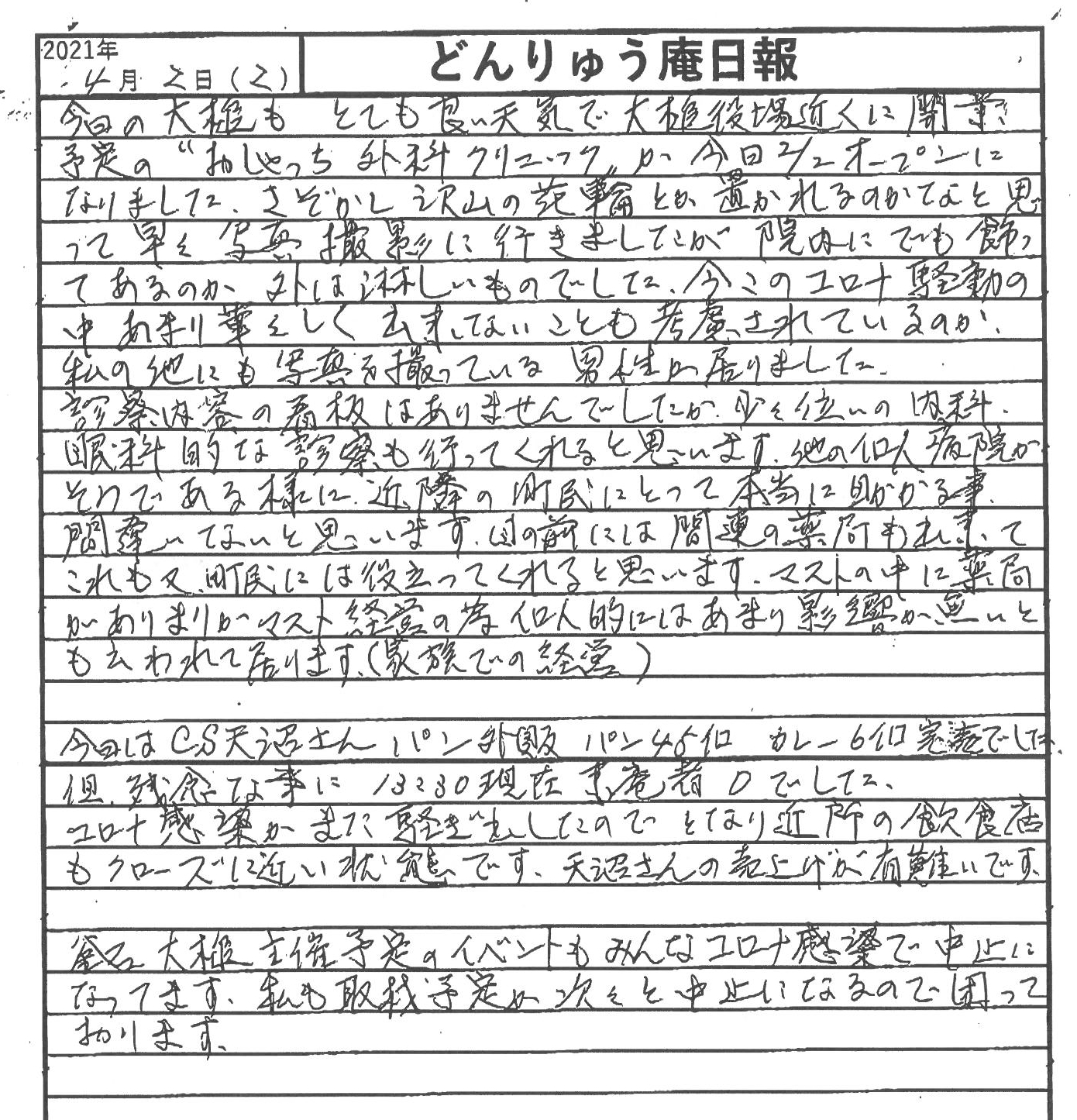 2022年2月9日 大槌町に、おしゃっち外科クリニックが多くの町民の期待を受けて新たにオープンしました。その模様とコミュニティハウス「どんりゅう庵」のお客様などについて、震災機構のお嬢こと佐藤悦子特別顧問(岩手県大槌町在住)の現地報告です。 FacebookXCopy