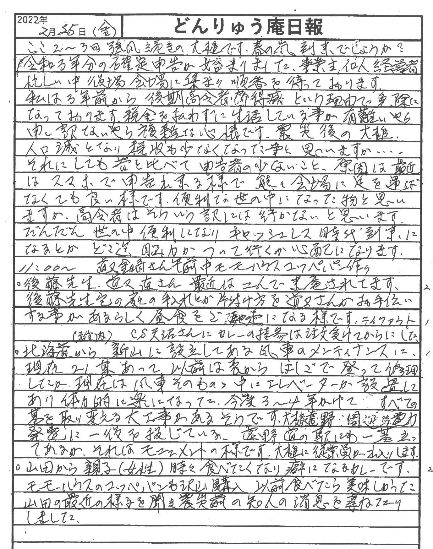 2022年3月2日 大槌では、確定申告会場に来る人が今年は大きく減少しているようです。その様子や、コミュニティハウス「どんりゅう庵」のお客様などについて、震災機構のお嬢こと佐藤悦子特別顧問(岩手県大槌町在住)の現地報告です。 大槌町の確定申告会場 FacebookXCopy