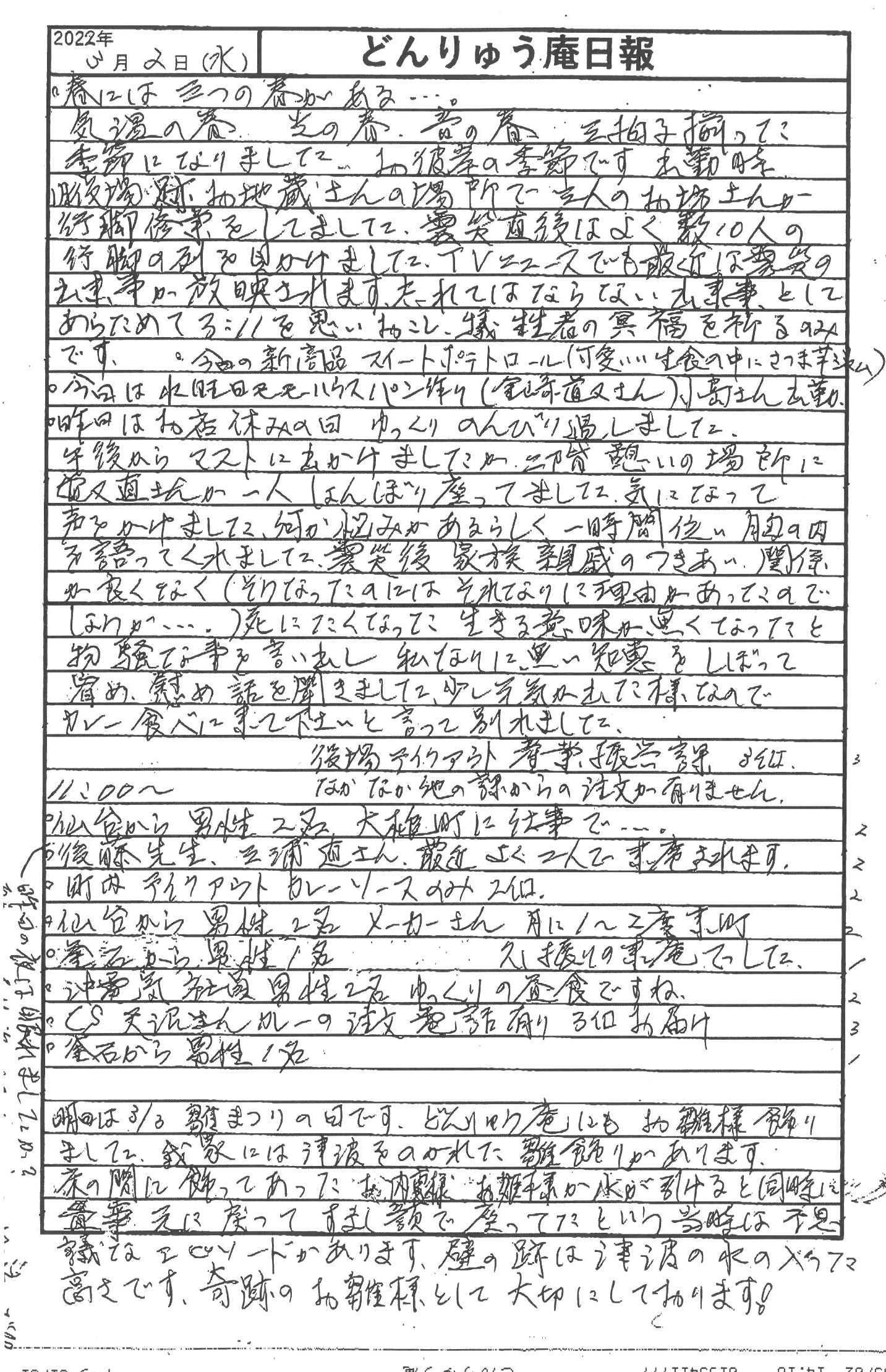 雛祭りの日がが来ました。11年前の震災の津波を逃れたお雛様や、モーモーハウスの新商品「スイートポテトロール」や、コミュニティハウス「どんりゅう庵」のお客様などにつて、震災機構のお嬢こと佐藤悦子特別顧問(岩手県大槌町在住)の現地報告です。