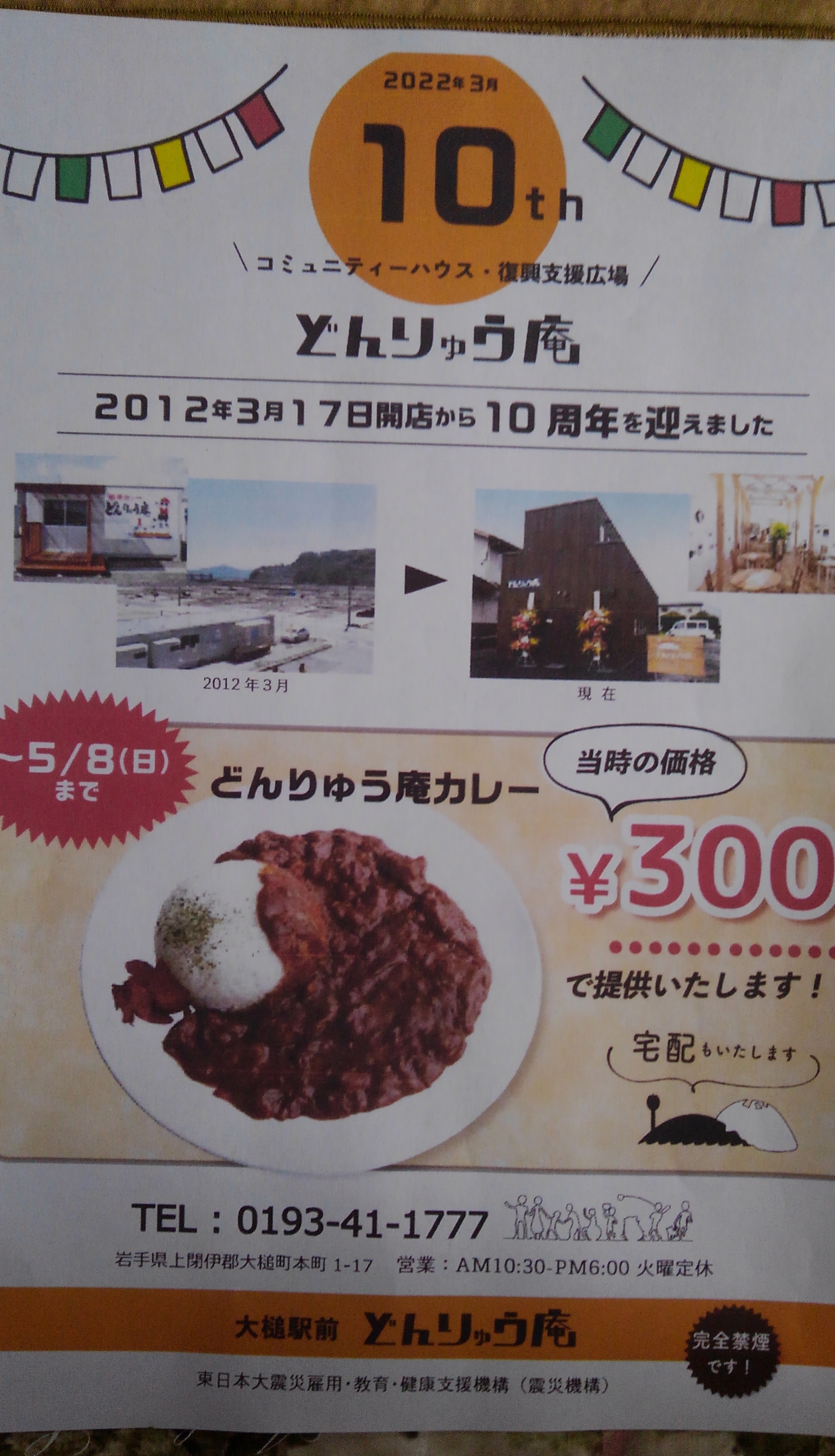 今年は開設10周年を迎えました。その記念として5月8日まで当時の価格300円で、どんりゅう庵カレーの提供を始めました。その模様とコミュニティハウス「どんりゅう庵」のお客様などについて、震災機構のお嬢こと佐藤悦子理事長代理(岩手県大槌町在住)の現地報告です。