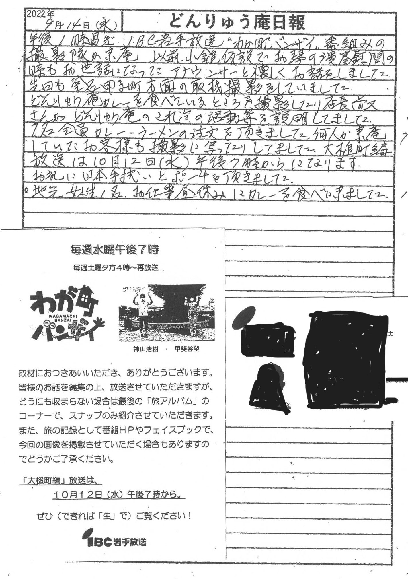 2022年9月16日 コミュニティハウス「どんりゅう庵」は、IBC岩手放送のアポなしぶらり旅「わが町バンザイ」番組の取材を受けました。その様子や、(一社)おらが大槌夢広場移住定住事務局によるココカラ オオツチの活動紹介や、どんりゅう庵のお客様などについて、震災機構のお嬢こと佐藤悦子理事長代理(岩手県大槌町在住)の現地報告です。なお、番組の放送予定日は令和4年10月12日(水)午後7時~7時57分です。是非ご覧ください。 【岩手放送の番組取材風景】 【モモ-ハウス大槌のコッペパン】 FacebookXCopy