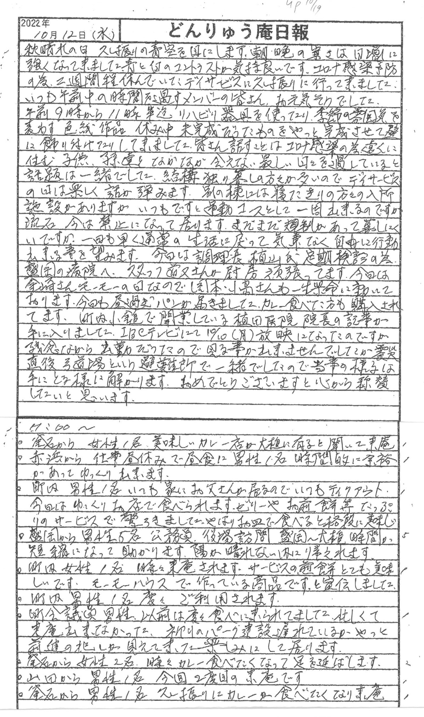 大槌では、秋が日に日に深まり朝晩は寒くなってきました。普段定期的に通っているデイサービスの様子や、コミュニティハウス「どんりゅう庵」のお客様などについて、震災機構のお嬢こと佐藤悦子理事長代理(岩手県大槌町在住)の現地報告です。