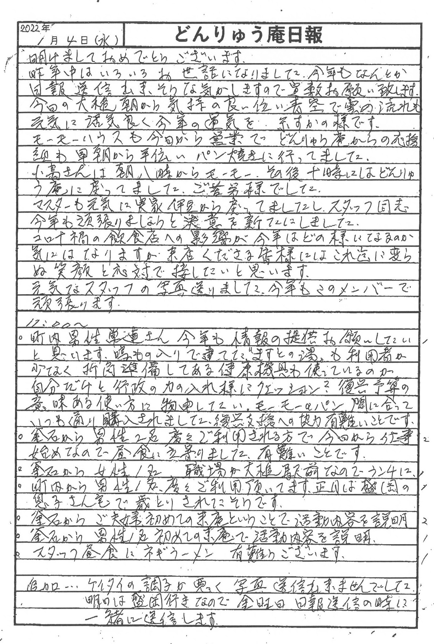 2023年1月6日 新年が明け、コミュニティハウス「どんりゅう庵」の営業が始まりました。 その様子や、お客様などについて、震災機構のお嬢こと佐藤悦子理事長代理(岩手県大槌町在住)の現地報告です。 FacebookXCopy