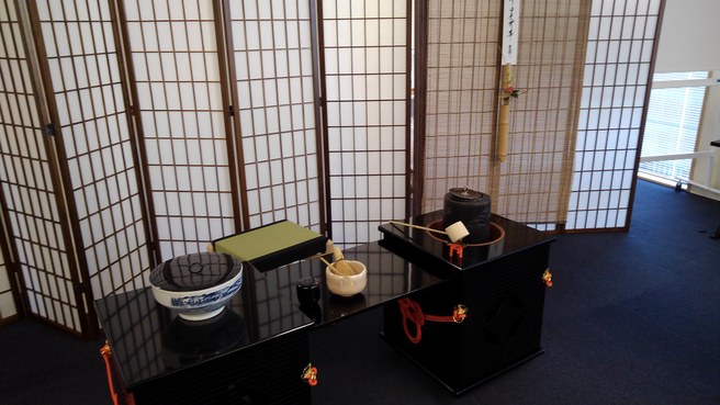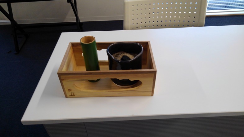 【来場者に提供されたお菓子とお抹茶】 茶道具全ては被災地(大槌町、陸前高田市等)のいわれのあるもの