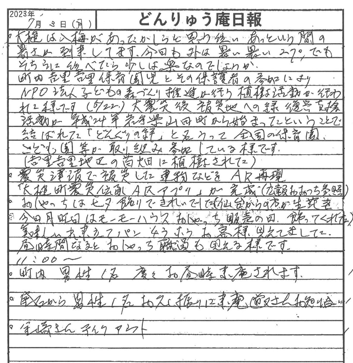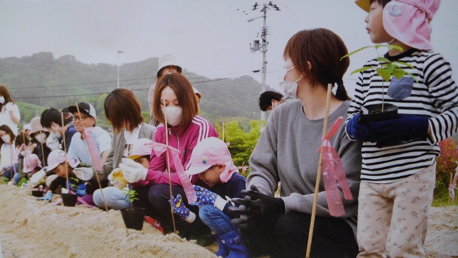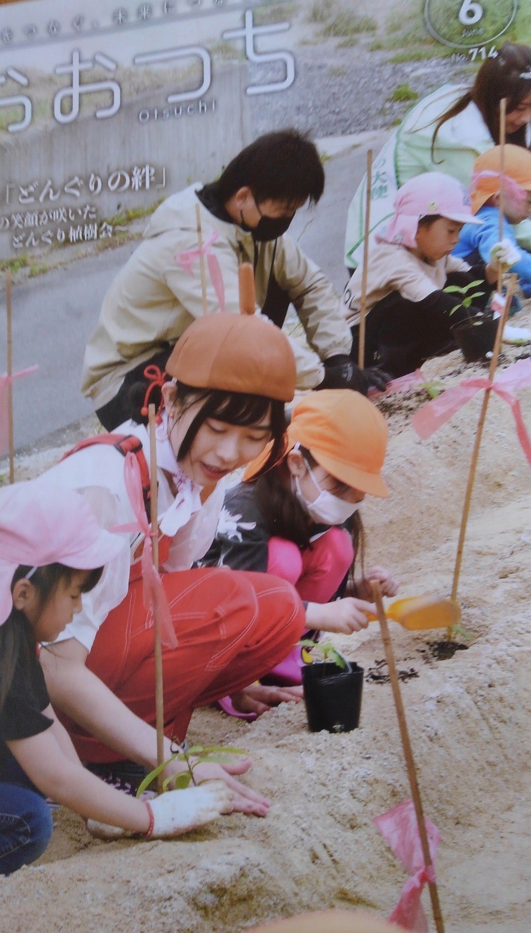 「東北復興グリーンウェイブ」の植樹会が大槌で開催され、「つつみこども園」と「吉里吉里保育園」の子どもたちと保護者などが参加し、全国から届けられた東北のどんぐりの苗木を植えました。この活動は2012年から始まりました。他に焼き立てパンのモーモーハウスの菓子やパンを販売中の七夕飾りのおしゃっち(大槌町文化交流センター)やコミュニティハウス「どんりゅう庵」のお客様などについて、震災機構のお嬢こと佐藤悦子相談役(岩手県大槌町在住)の現地報告です。