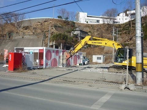 モーモーハウスの隣の駐車場でもコンクリートの撤去作業が行われました。ショベルカーがコンクリートを壊した際にはモーモーハウスの店内も大きく揺れて、ちょうどいらしたお客様も驚かれた様子でした。