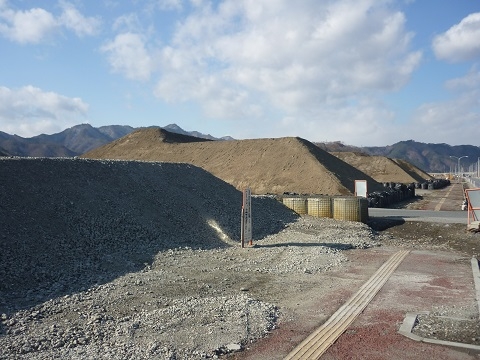 2014年1月21日 岩手県大槌町赤浜の港近くの土地に、これから土地のかさ上げに使用するための土や砂利を山積みにしてありました。今後これらの資材を利用して土地のかさ上げ事業が進んでいくことでしょう。 2014年1月11日撮影 FacebookXCopy