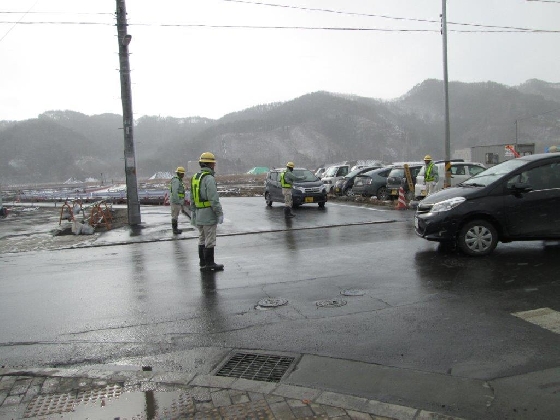 新道路走行に不慣れな自動車は、工事関係者の誘導に戸惑っていました。