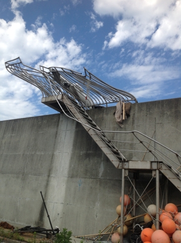 このあたりの防潮堤は傾いたり、倒れたりもしています。そんな中、ステンレス製の手すりがゆがんだまま、まるでオブジェのように取り残されていました。