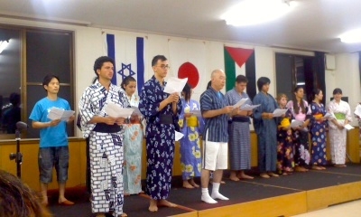ふだんはなじみのない中東のイスラエルやパレスチナの青年たちとの交流です。みんなが浴衣を着て歌ったり踊ったりのにぎやか。また、フランス人シェフによるアラブ料理の提供もあり、タイトル通りの「おいしいたのしい」時間となりました。