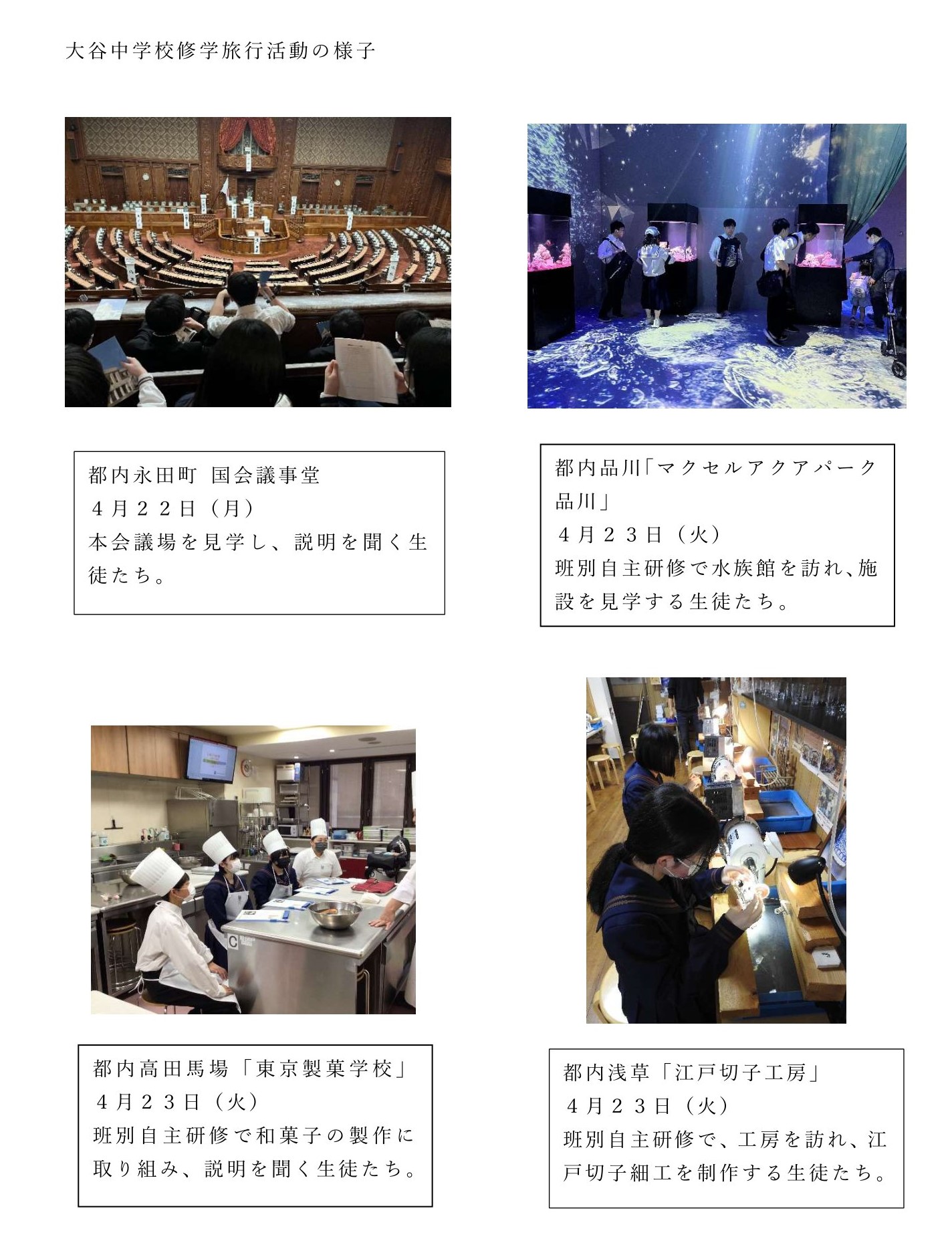 このたび、宮城県気仙沼市教育委員会様から気仙沼市立大谷(おおや)中学校の東京方面(国会議事堂、都内自主研修など)への修学旅行写真(2024年4月22日~23日)が届きました。