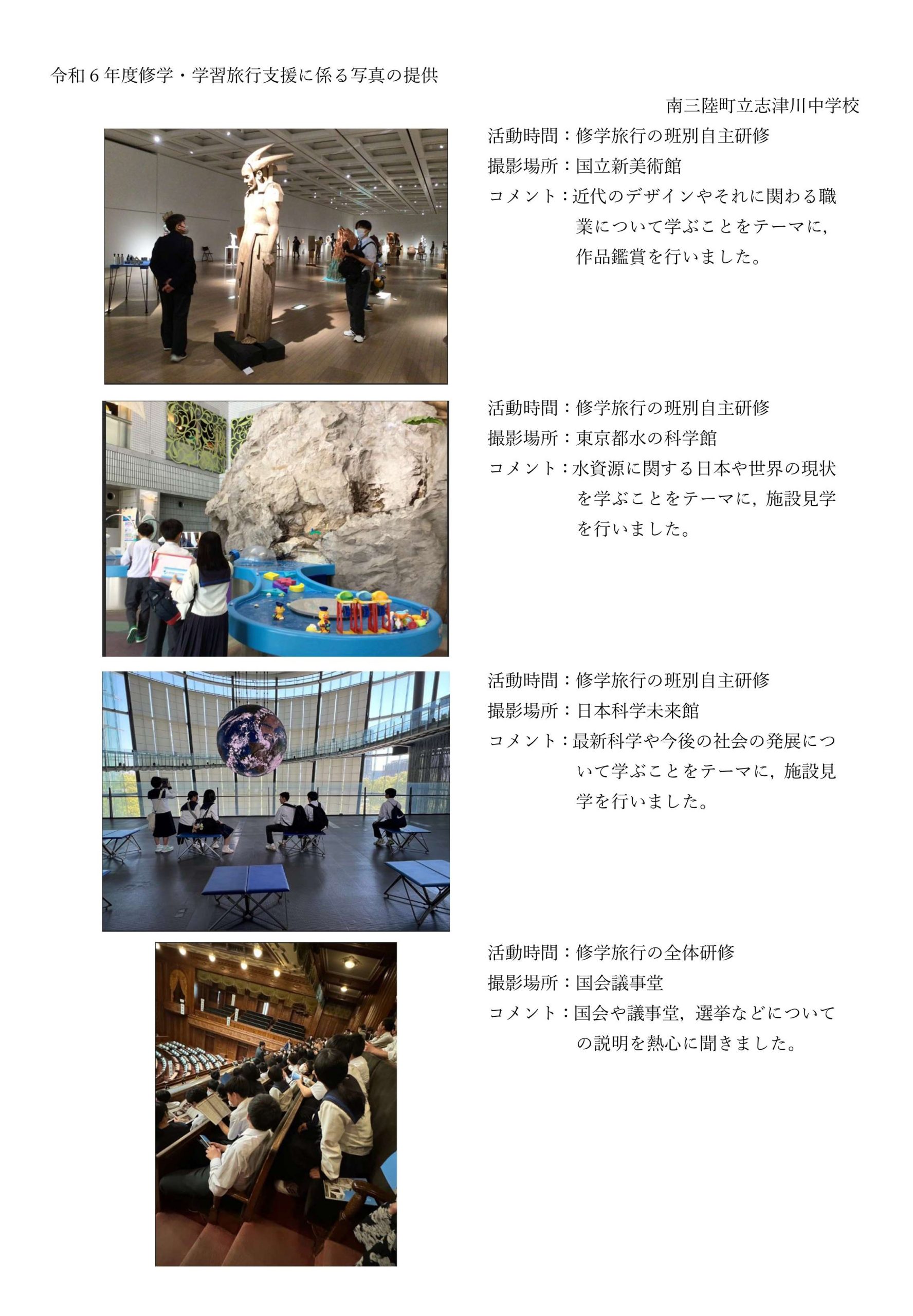 このたび、宮城県本吉郡の南三陸町教育委員会様から南三陸町立志津川中学校が令和6年5月9日~11日に実施した東京方面への修学旅行写真が届きました。