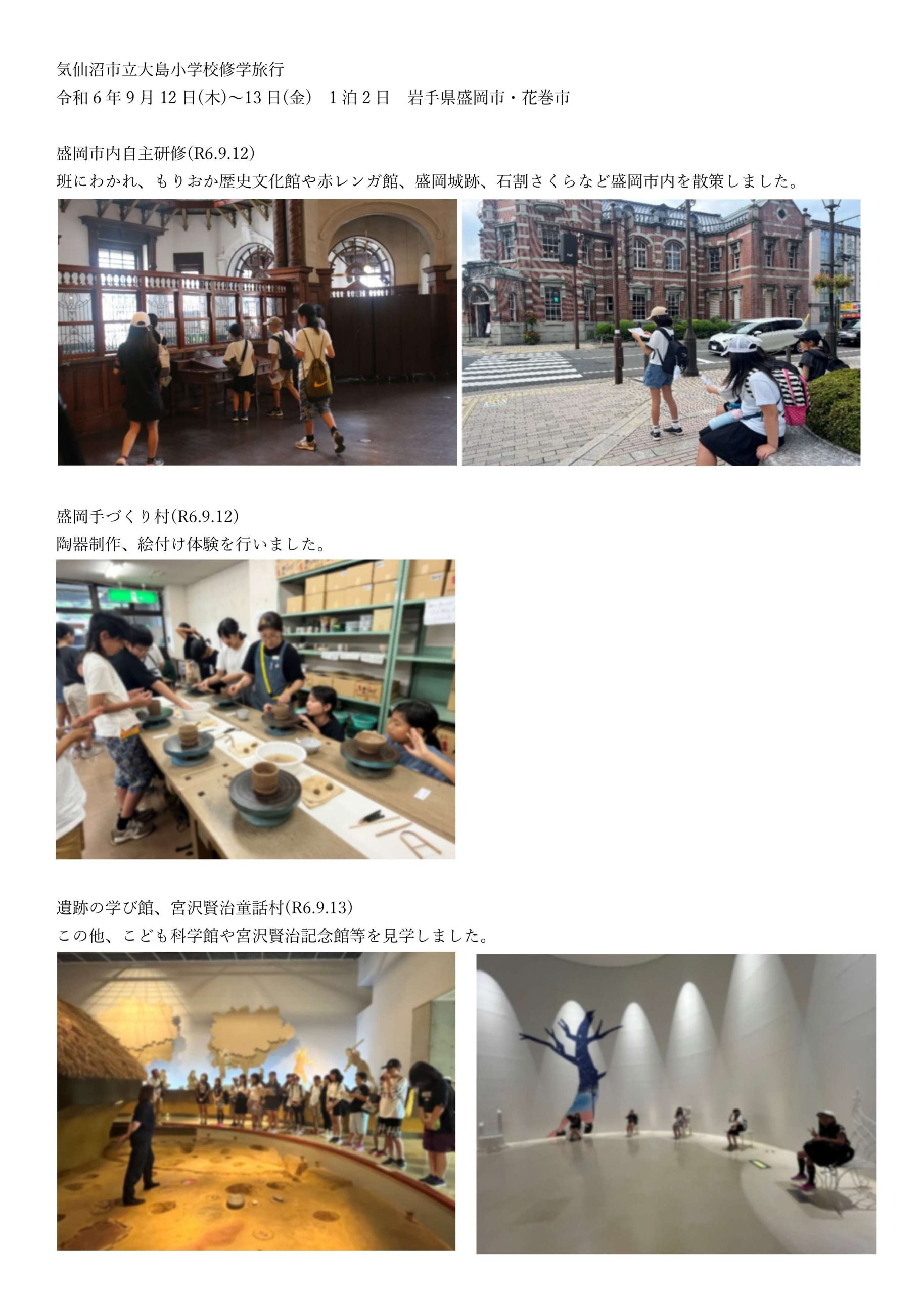 このたび、宮城県気仙沼市教育委員会様から気仙沼市立大島小学校が令和6年9月12日~13日に実施した盛岡・花巻方面への修学旅行写真が届きました。