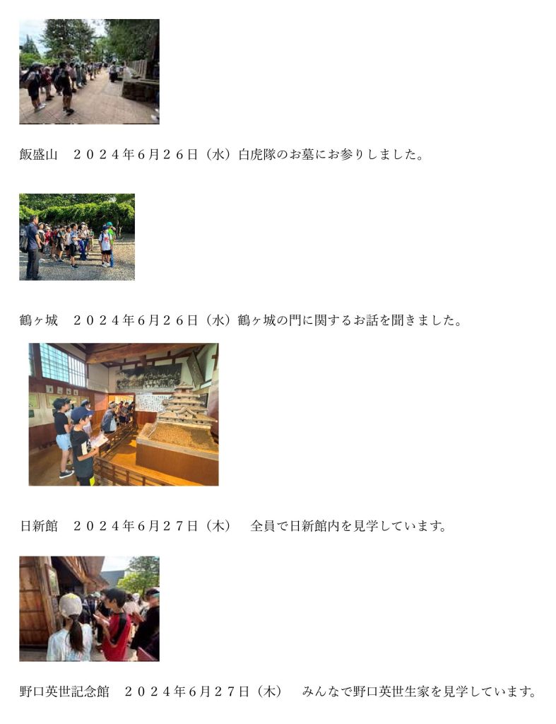 このたび、宮城県気仙沼市教育委員会様から気仙沼市立松岩小学校が令和6年6月26日~27日に実施した会津若松市方面への修学旅行写真が届きました。