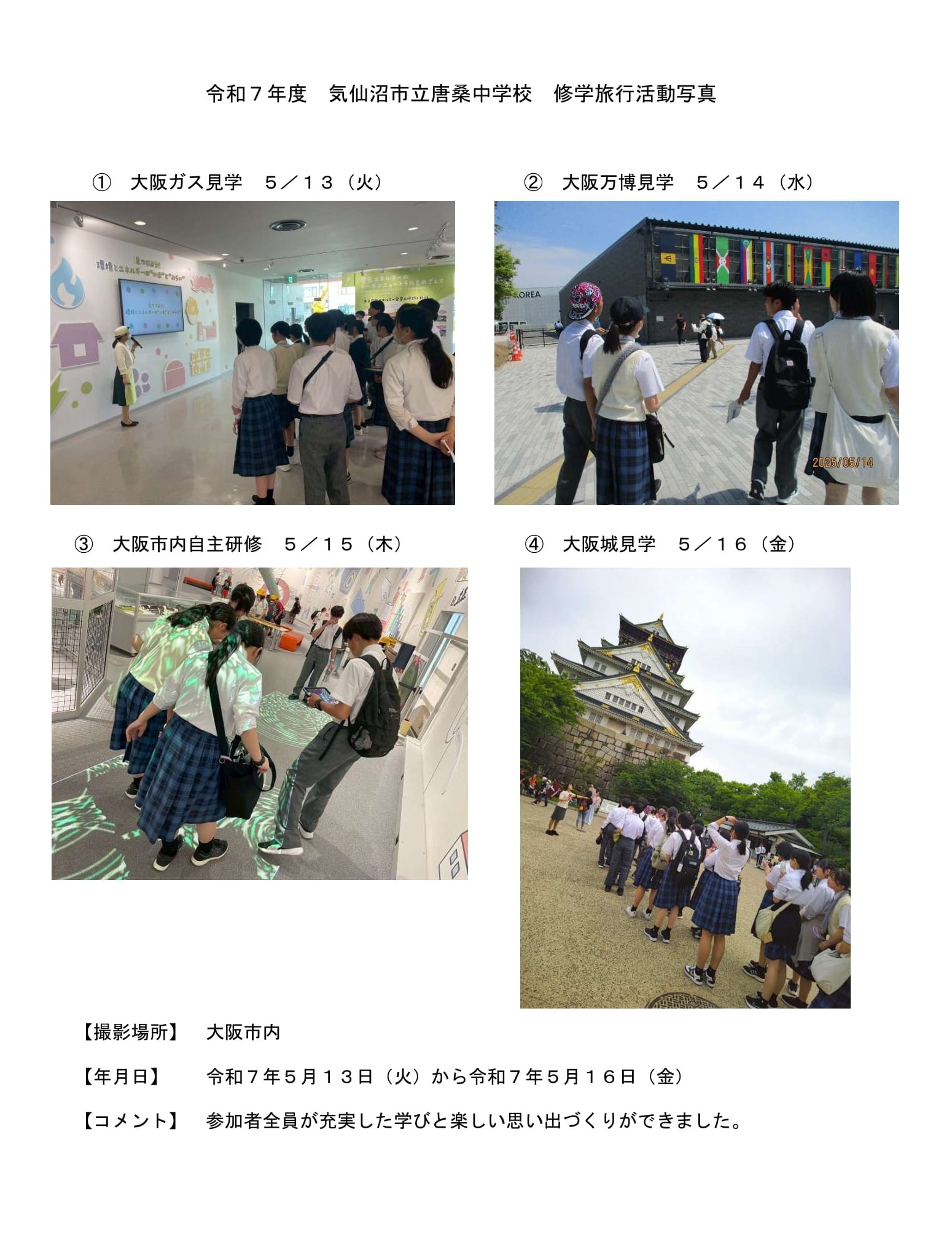 このたび、宮城県気仙沼市教育委員会様から気仙沼市立唐桑中学校が令和7年5月13日~16日に実施した大阪・関西万博、大阪市方面への修学旅行写真が届きました。