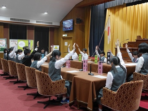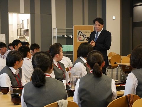 写真は、国会を体験・見学する「参議院特別体験プログラム」における模擬委員会の実施風景で、気仙沼市出身の小野寺五典防衛大臣からの説明を真剣に聞いています。