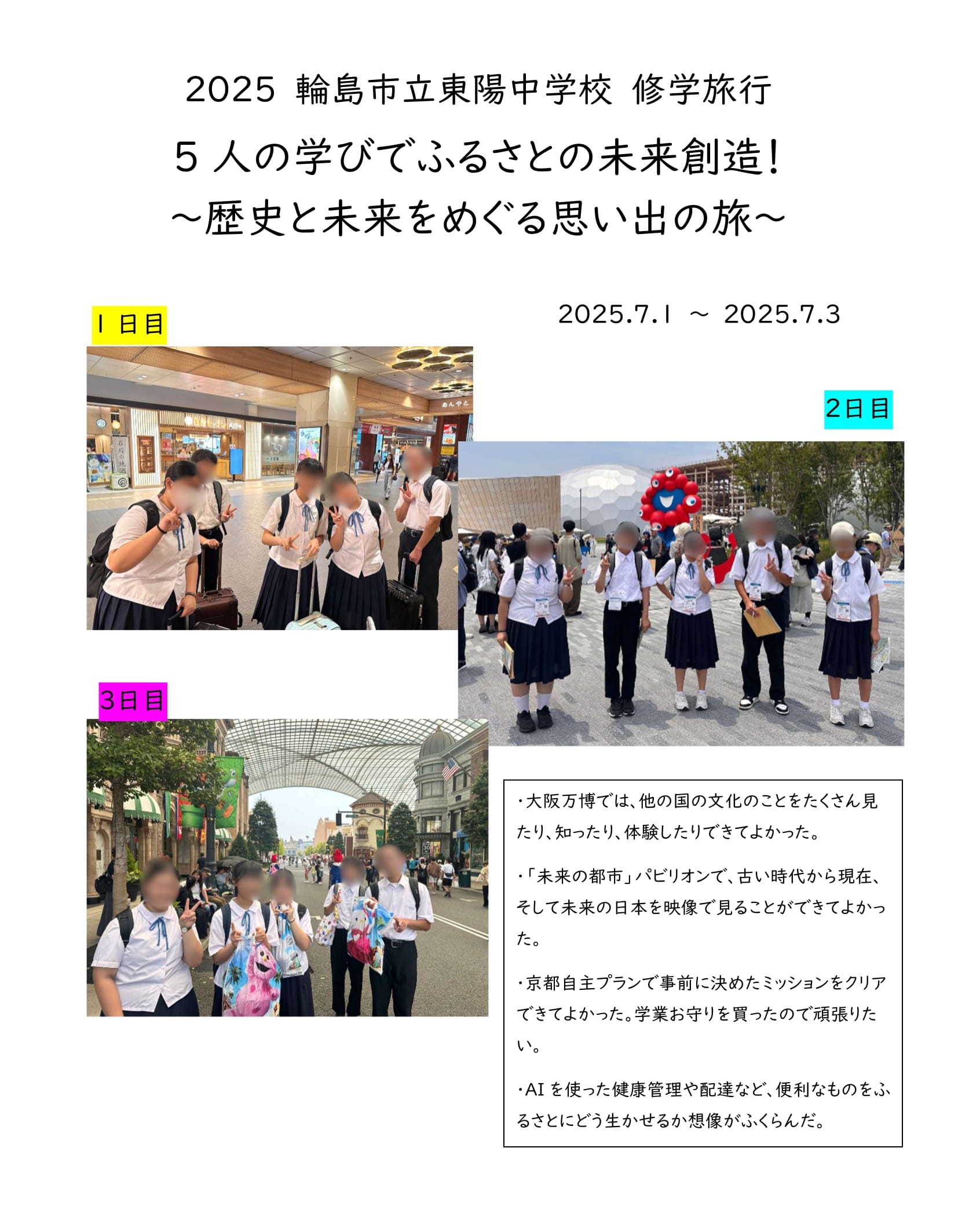 このたび、石川県輪島市教育委員会様から輪島市立東陽学校が、令和7年7月1日~3日に実施した大阪・関西万博、奈良方面への修学旅行の写真が届きました。