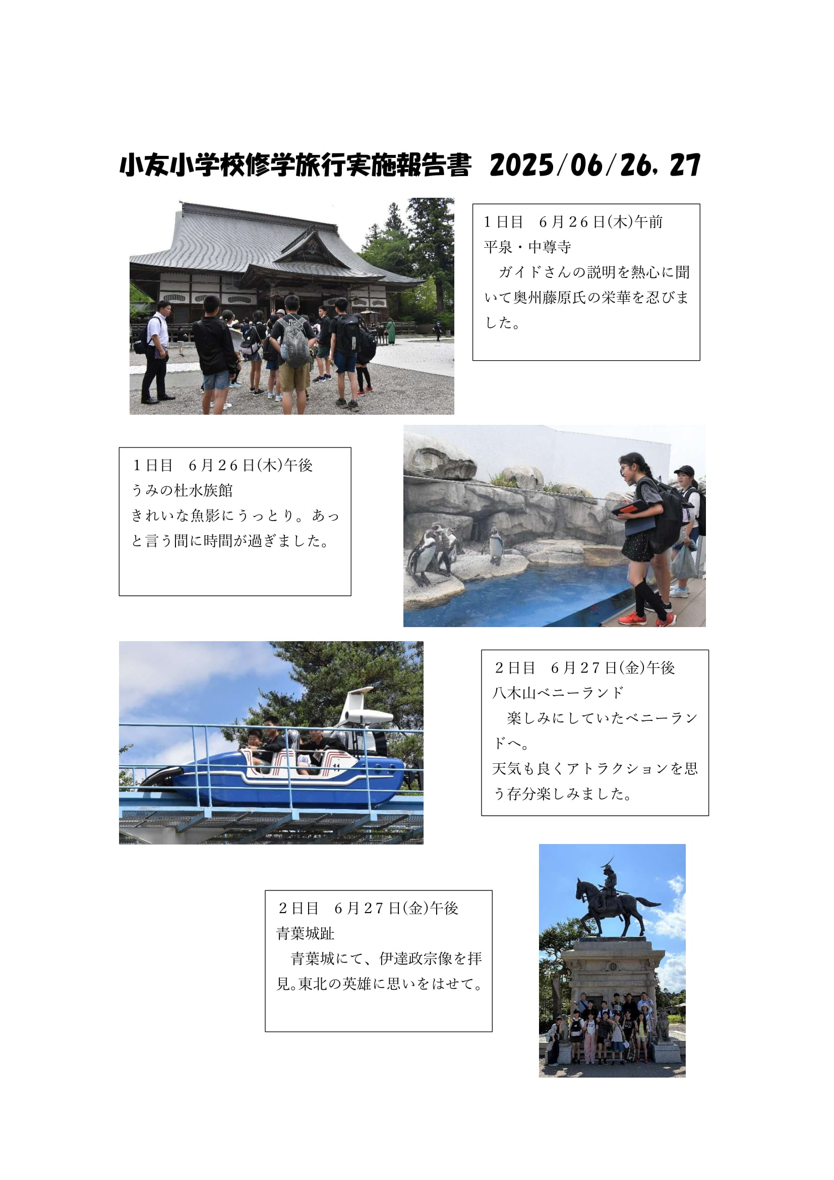 このたび、岩手県陸前高田市教育委員会様より、陸前高田市立小友小学校が令和7年6月26日から27日にかけて実施した、平泉町および仙台市方面への修学旅行の写真をご提供いただきました。