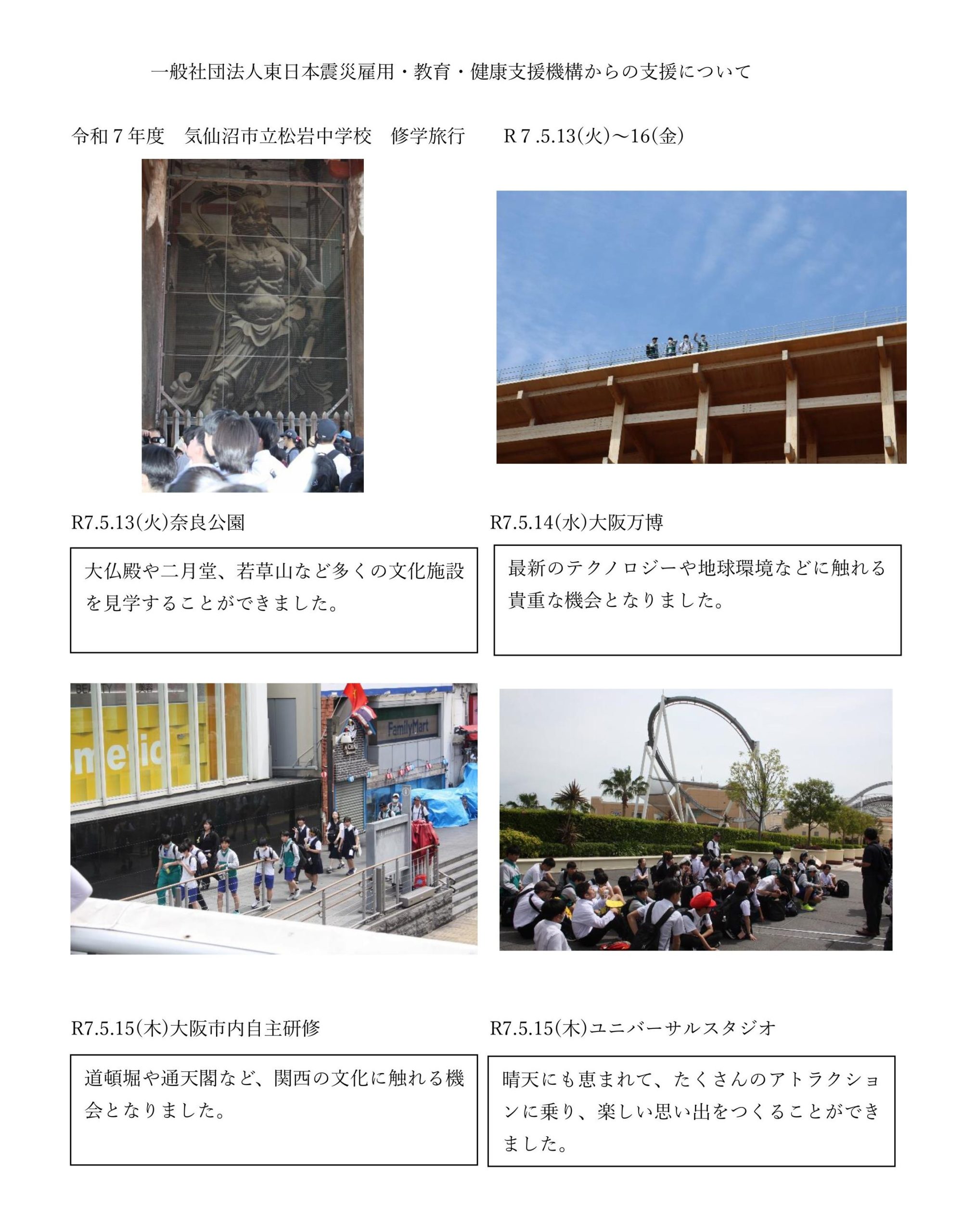 このたび、気仙沼市教育委員会様より、令和7年5月13日~16日に実施された気仙沼市立松岩中学校の大阪・関西万博、奈良方面への修学旅行の写真をご提供いただきました。