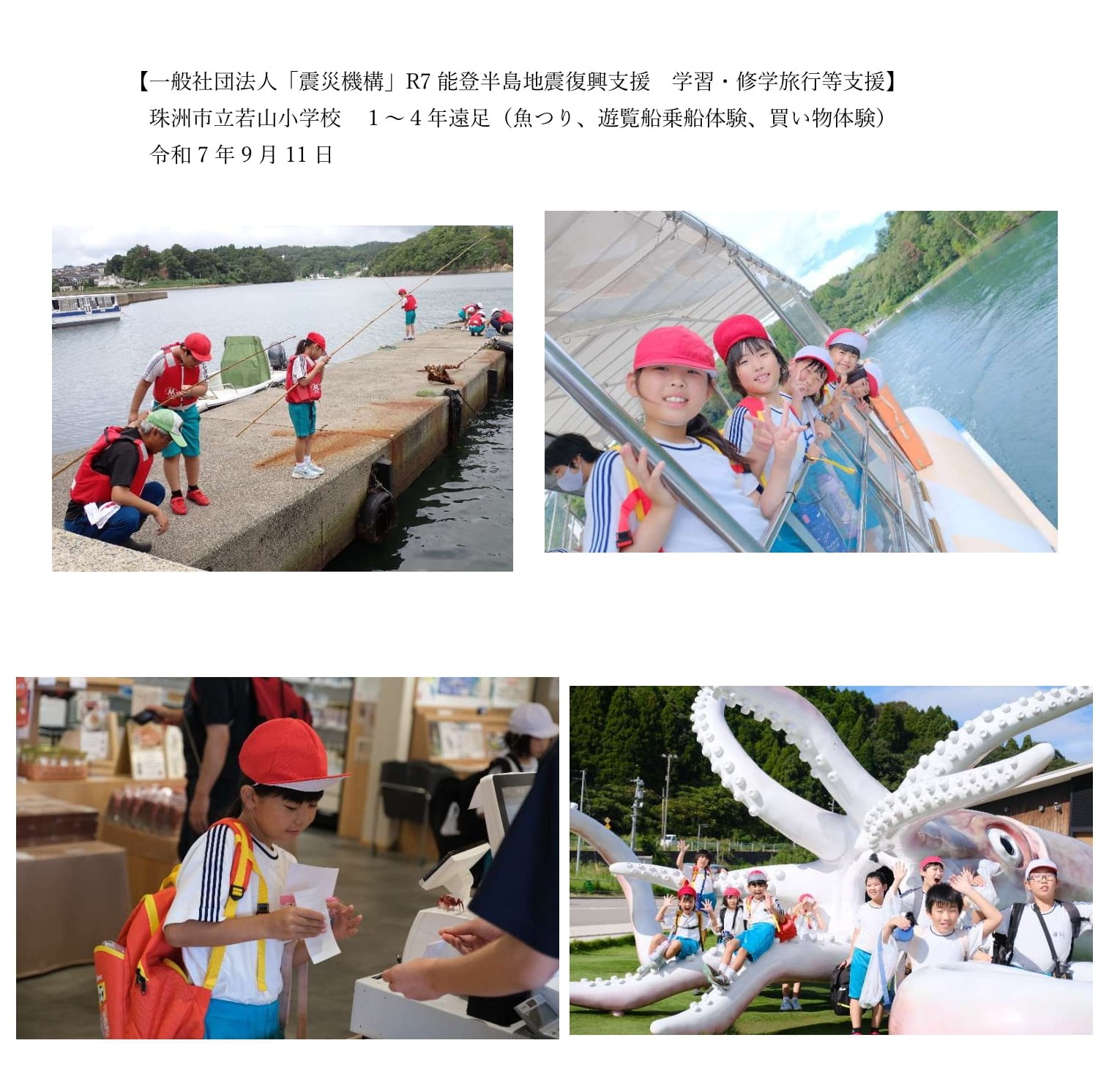 このたび、石川県珠洲市教育委員会様より、令和7年9月11日に実施された珠洲市立若山小学校の1年生から4年生による遊覧船体験学習旅行の写真をご提供いただきました。 青々と広がる美しい海の中で自然に触れた貴重な体験は、子どもたちにとって楽しい思い出として心に残ることでしょう。