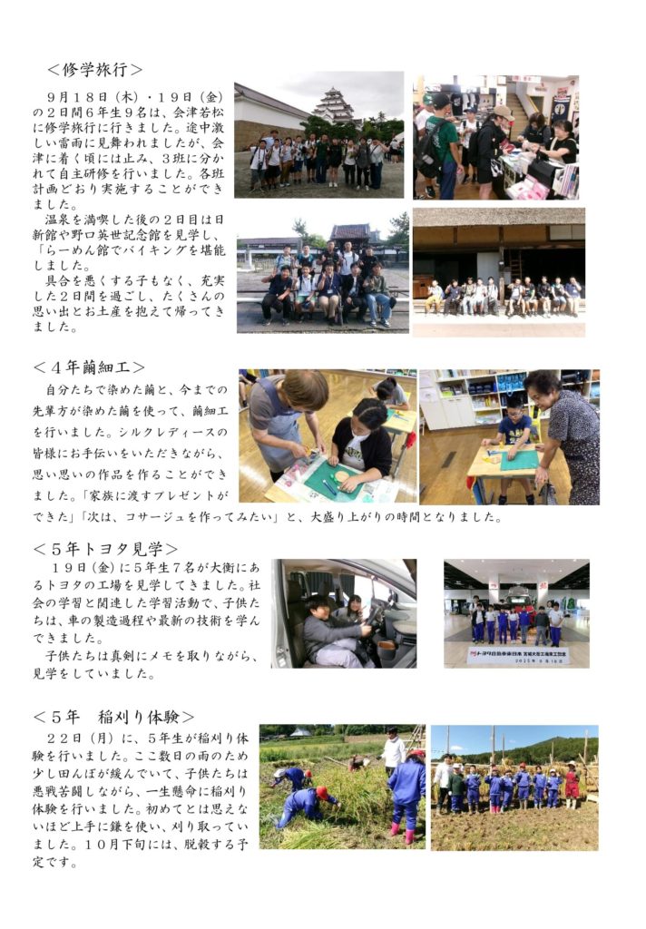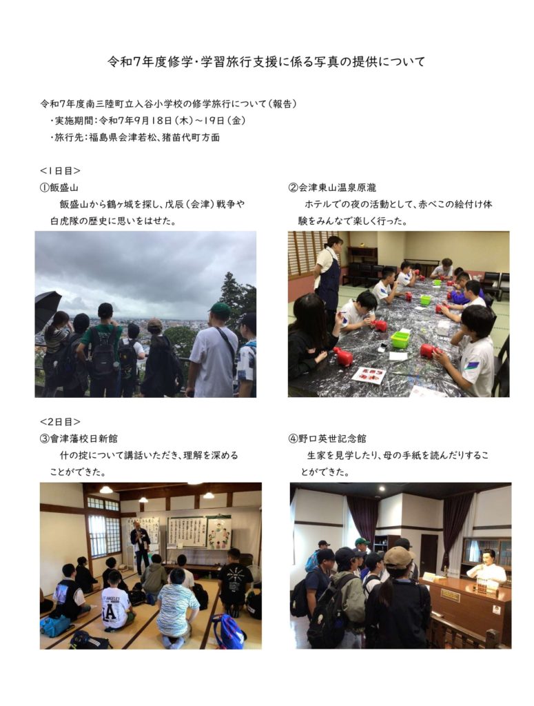 このたび、宮城県本吉郡の南三陸町教育委員会様より、2025年9月18日~19日に実施された南三陸町立入谷小学校の会津若松市方面への修学旅行の写真をご提供いただきました。