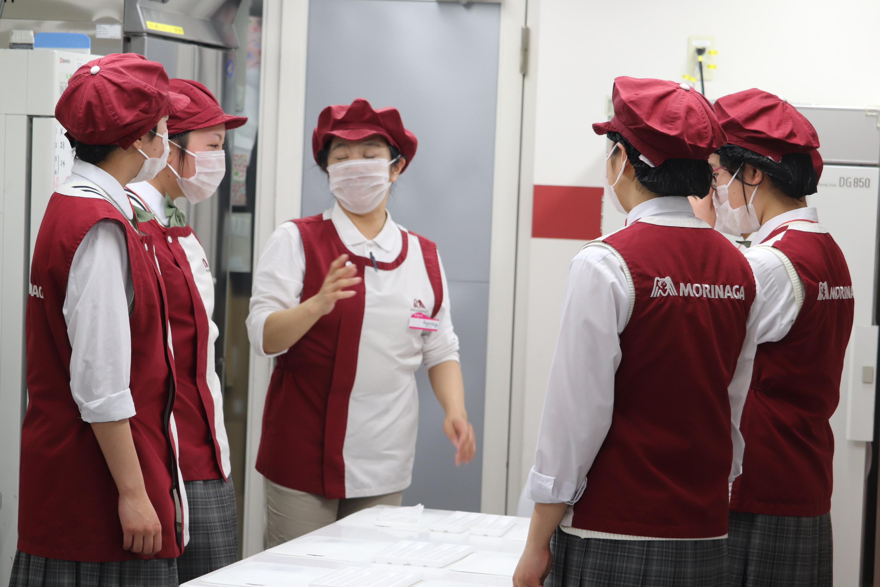 写真③ キッザニアでの職業体験の様子です。みんな真剣に話を聞いています。これからお菓子作りに挑みます。