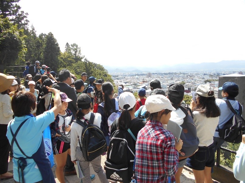 1.飯盛山にて撮影 秋晴れの中,飯盛山から鶴ヶ城を探している様子です。