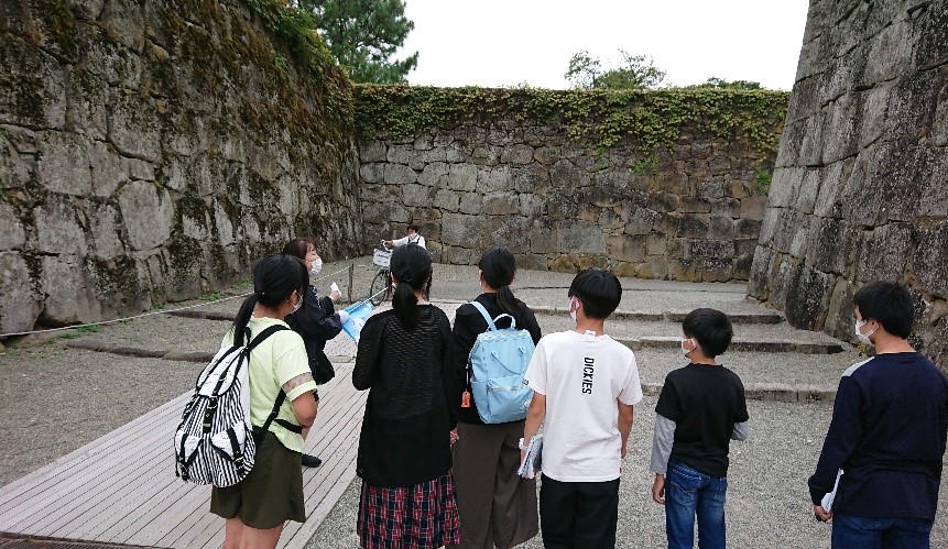 ①鶴ヶ城見学 ガイドの説明を聞きながら石垣見学。昔の人の知識や技術に驚きました。
