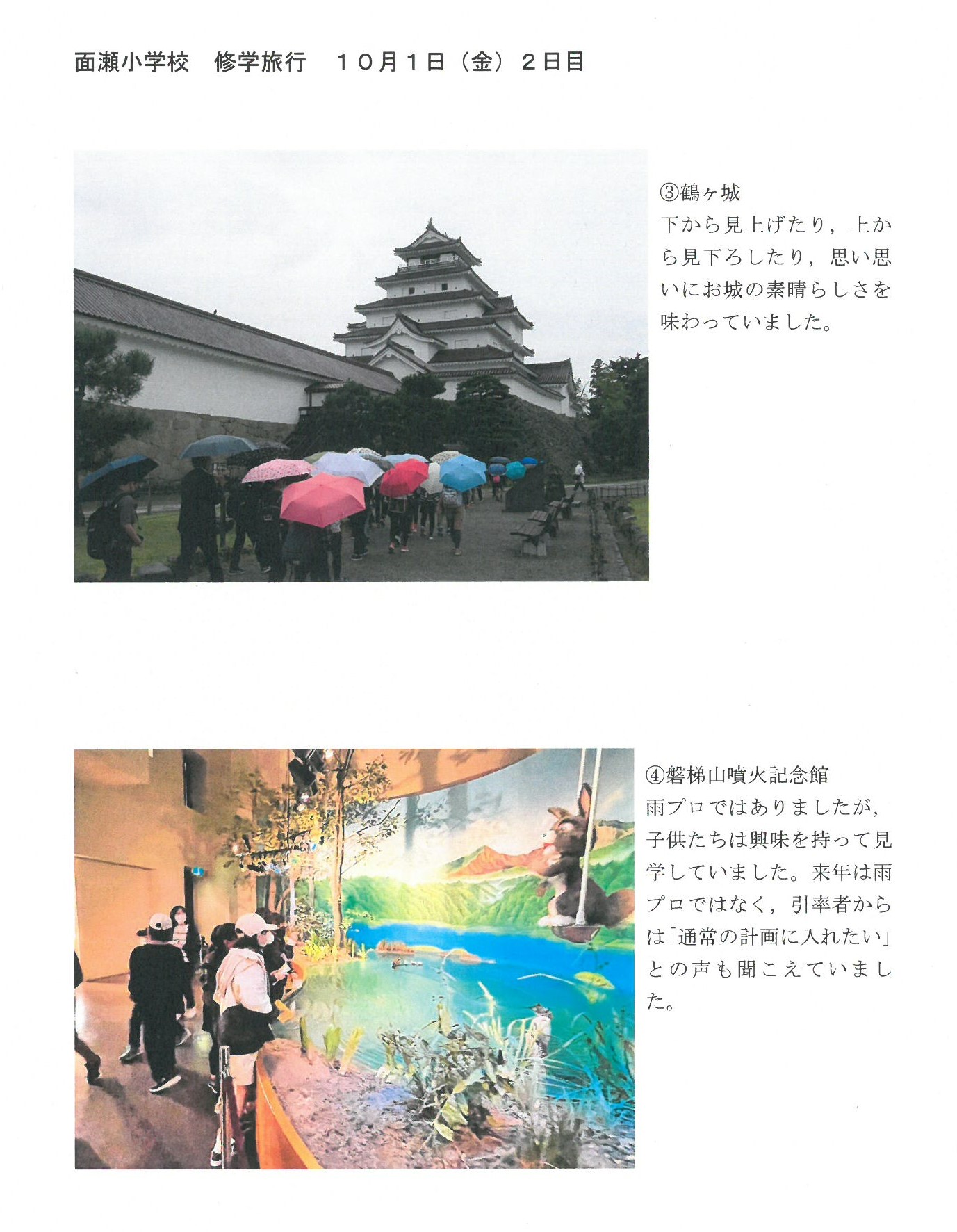 震災機構は、東日本大震災で甚大な被害を受けた岩手県、宮城県、福島県の被災地の公立小・中学校の修学・学習旅行資金の助成を、震災翌年の2012年より毎年行っています。このたび宮城県気仙沼市教育委員会様から、気仙沼市立面瀬小学校6年生による会津若松市方面への1泊2日(9月30日~10月1日)の修学旅行写真が届きました。