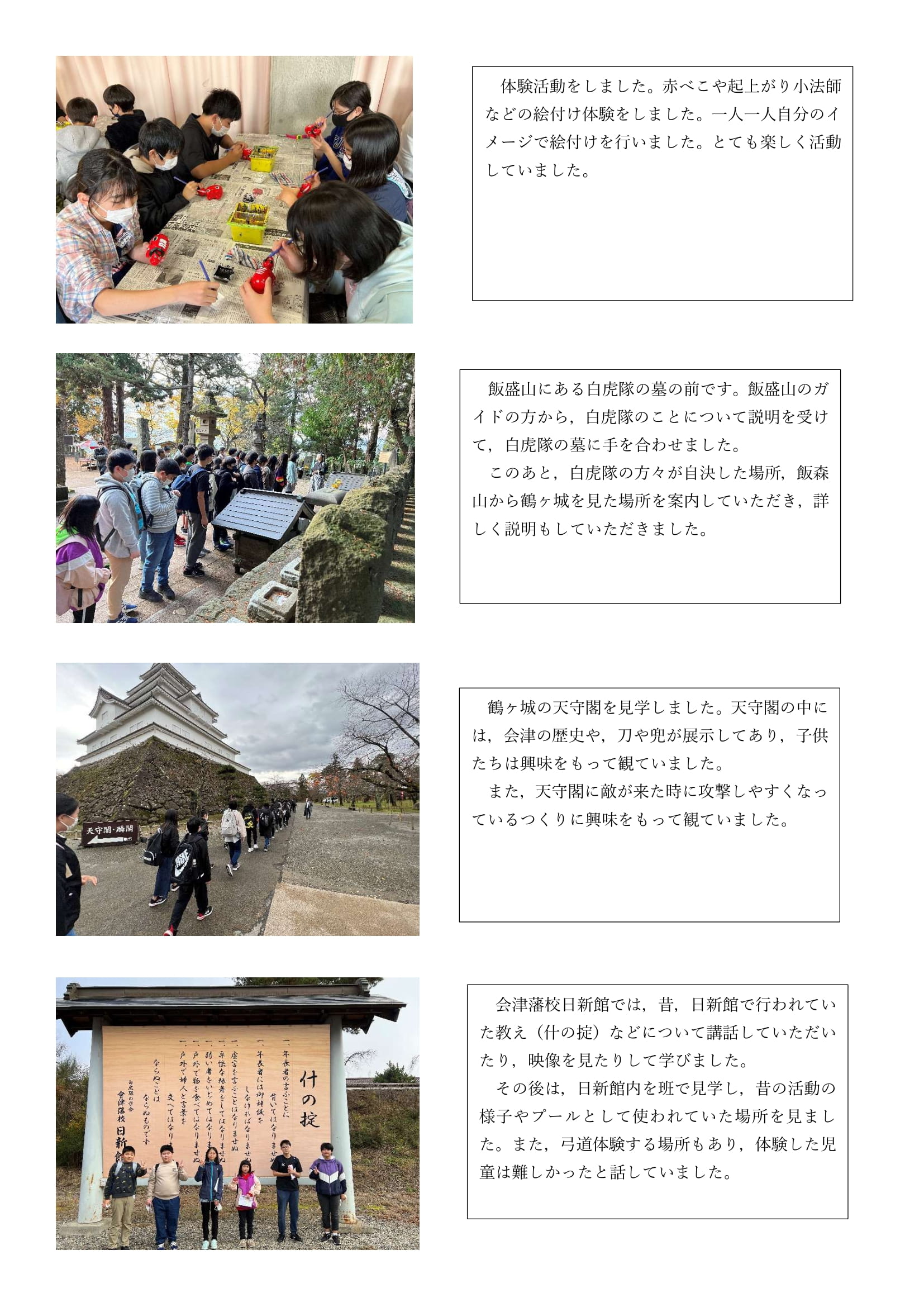 震災機構は、東日本大震災で甚大な被害を受けた岩手県、宮城県、福島県の被災地の公立小・中学校の修学・学習旅行資金の助成を、震災翌年の2012年より毎年行っています。このたび宮城県牡鹿郡女川町立女川小学校から2011年11月16日~17日に実施された会津若松方面への修学旅行写真が届きました。