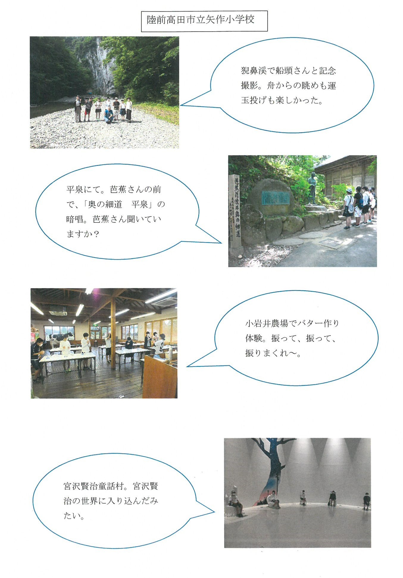 震災機構は、東日本大震災で甚大な被害を受けた岩手県、宮城県、福島県の被災地の公立小・中学校の修学・学習旅行資金の助成を、震災翌年の2012年より毎年行っています。このたび、岩手県陸前高田市教育委員会様から陸前高田市立矢作小学校の岩手県花巻市や平泉町方面への修学旅行写真が届きました。