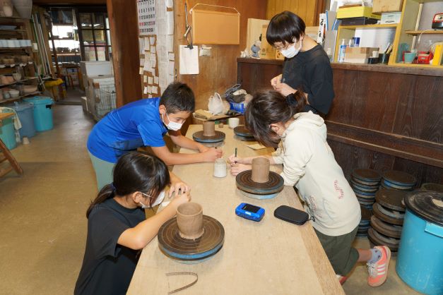 ①自主研修で会津慶山焼の手びねり体験を行い,湯飲みを作りました。(9/21)