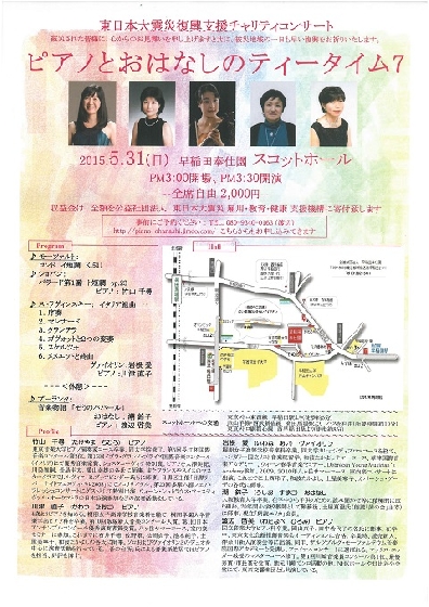 「ピアノとおはなしのティータイム7」東日本大震災復興支援チャリティコンサートが5月31日(日)に早稲田奉仕園スコットホールで開催されます。このコンサートの収益を全額、当機構にご寄付いただくことになりました。