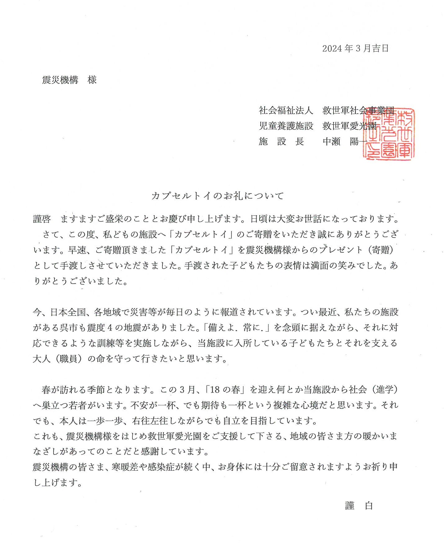 このたび、広島県呉市の社会福祉法人 救世軍社会事業団 児童養護施設 救世軍愛光園様からお礼状が届きました。 ありがとうございます。